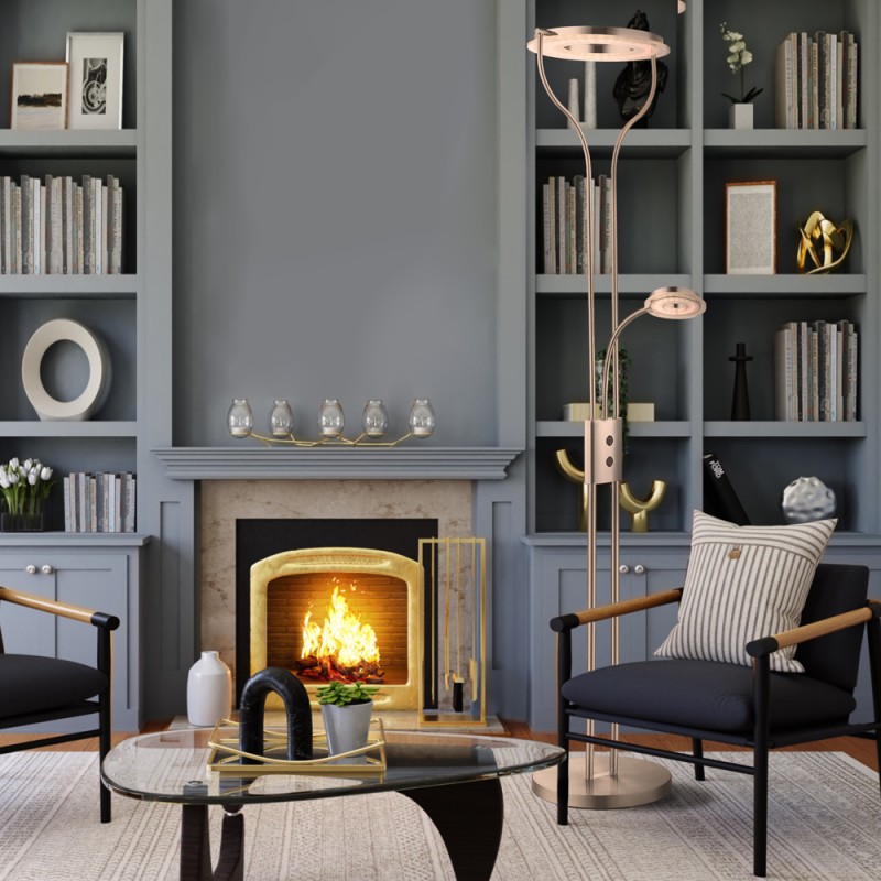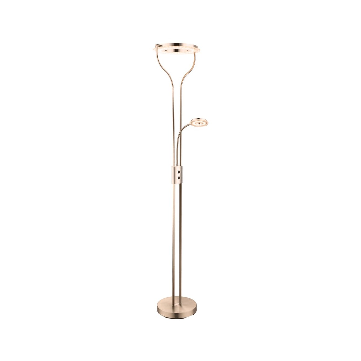 Lámpara de pie clásica con acabado oro viejo, con luz princiapl de 20W orientable y luz de lectura de 5W. El cable mide 180cm.