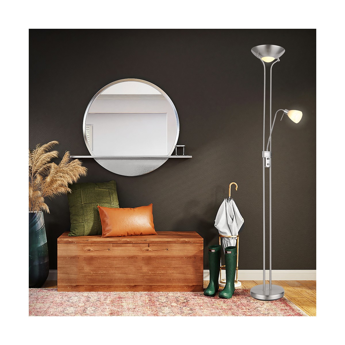 Lámpara de pie clásica de aluminio con acabado níquel. Cuenta con dos luces, la luz principal funciona con dos bombillas E27, mientras que la luz del lector tiene una rosca para bombilla E14 con una tulipa de cristal blanco mate. Las dos bombillas E27 pueden encenderse por separado o simultáneamente. El brazo del lector puede puede orientarse. El cable mide 180cm.