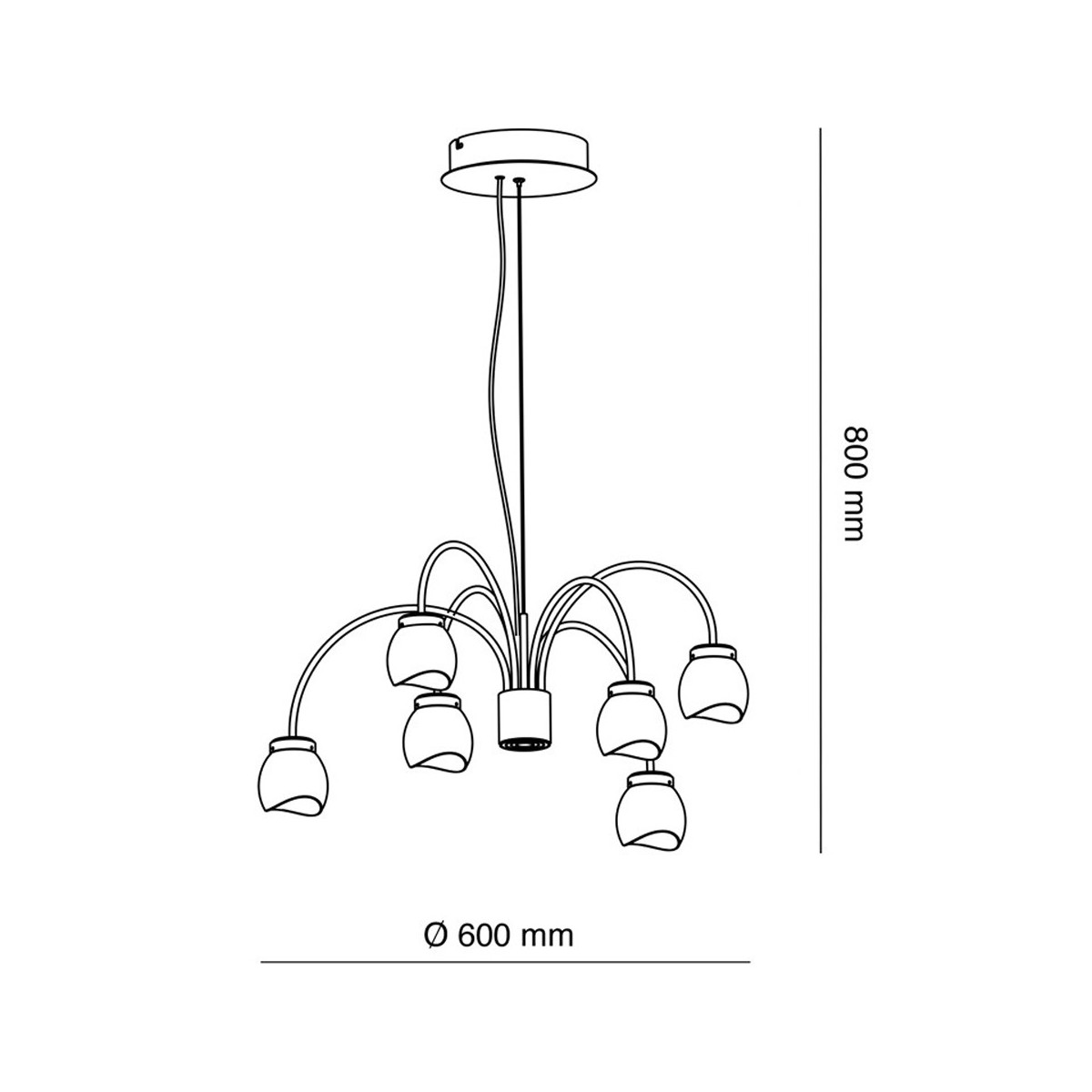 Lámpara de araña de la colección Fany. Potencia de 30W con luz cálida (3000K). Tiene 6 pantallas de cristal prensado extraclaro.