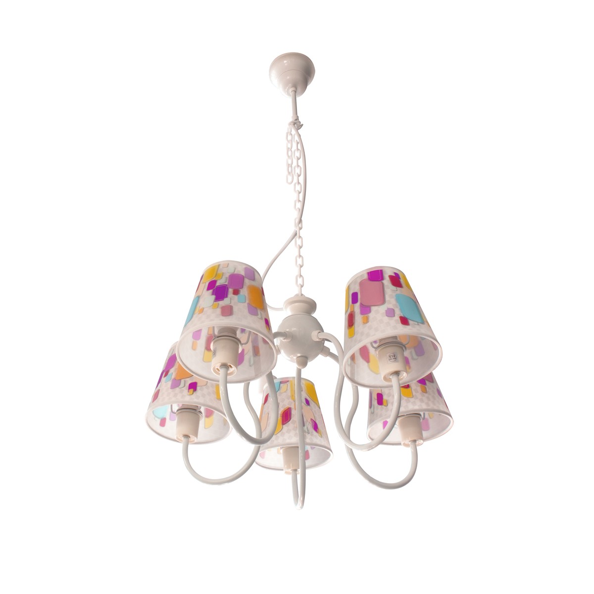 Lámpara de techo infantil con dibujos geometricos de varios colores en la pantalla fabricada en plástico. Ideal para decorar habitaciones infantiles. Fácil reemplazo de la bombilla.