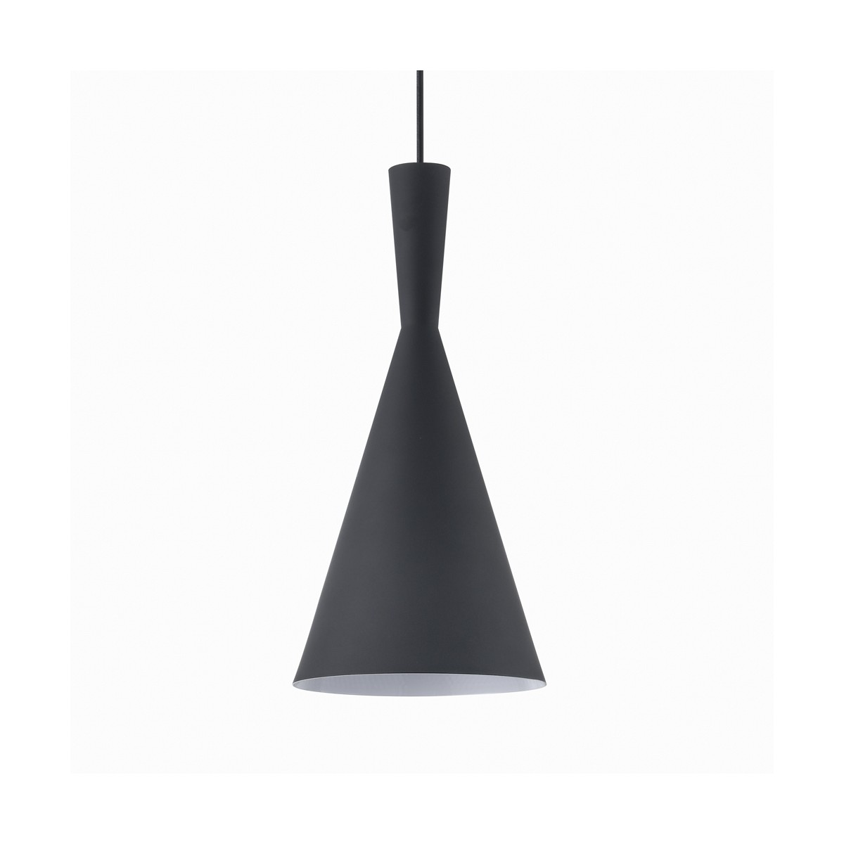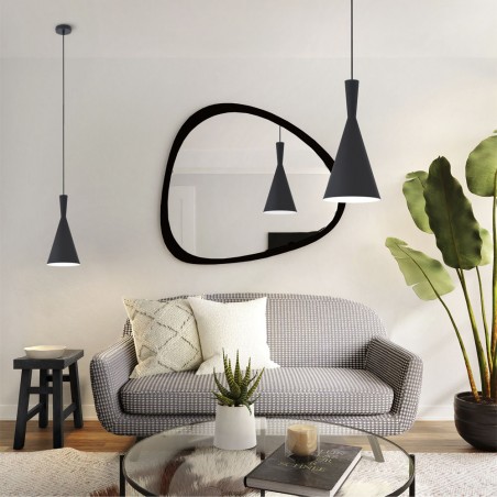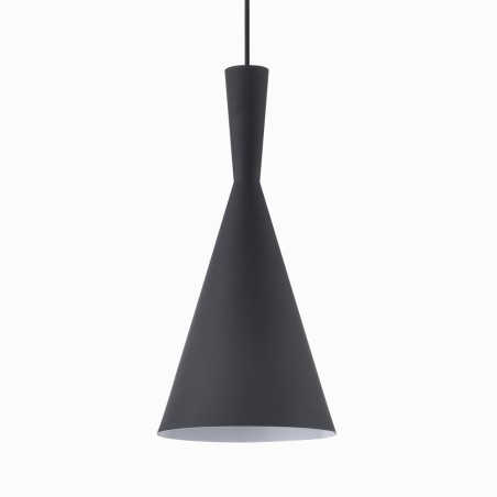 Lámpara colgante cónica negra para salones y dormitorios. Lámpara de techo de diseño minimalista perfecta para instalar en el techo de salones y dormitorios como iluminación decorativa. Pantalla metálica de color negro en forma cónica (interior de color blanco).