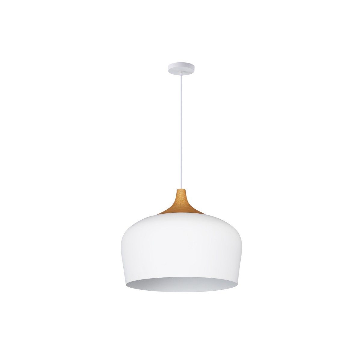 Lámpara colgante blanca para salones. Dale un toque nórdico a una estancia con esta lámpara colgante. Pantalla de cúpula con 30 centímetros de diámetro, fabricada con metal de color blanco y decoración de madera en la parte superior. Lámpara de techo perfecta para aportar iluminación en una zona concreta de la estancia como una zona de sofás.