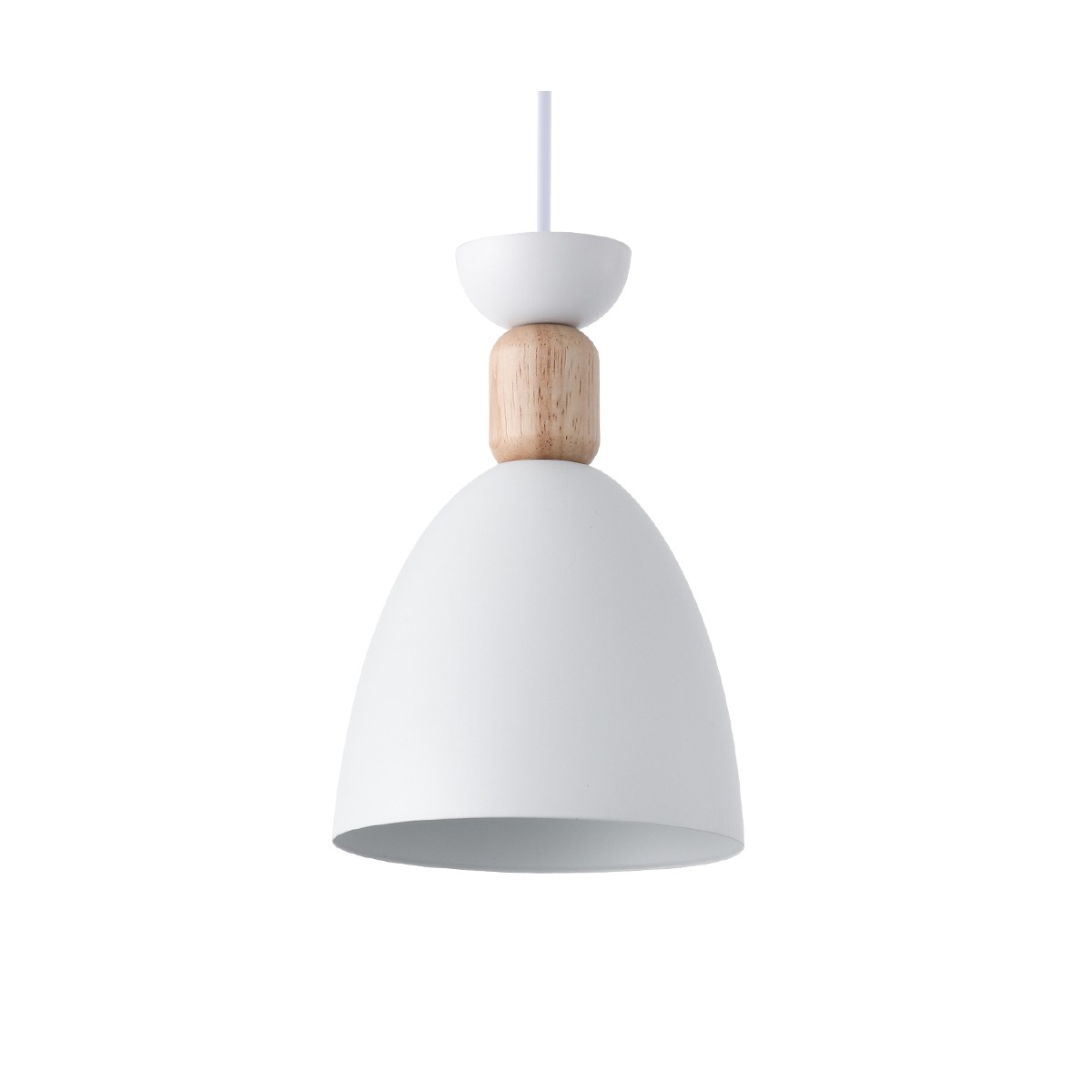 Lámpara colgante para salones y cocinas. Lámpara de techo de color blanco con una pieza de madera como decoración. Diseño de estilo nórdico combinando metal de color blanco y madera. Lámpara colgante para aportar luz sobre un punto concreto de la estancia. Puedes instalar varias lámparas colgantes en línea sobre una encimera o una mesa.