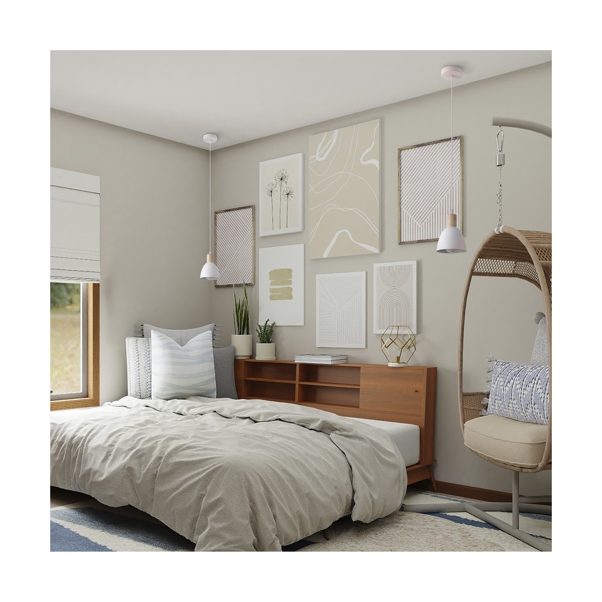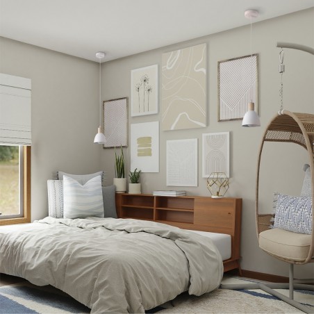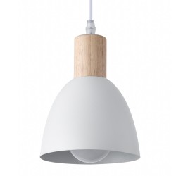 Lámpara colgante de estilo nórdico. Lámpara de techo de color blanco con pieza decorativa de madera sobre la pantalla. Su compacto diseño de solo 14 centímetros de diámetro la convierte en una solución ideal para instalar sobre la mesita de noche como iluminación.