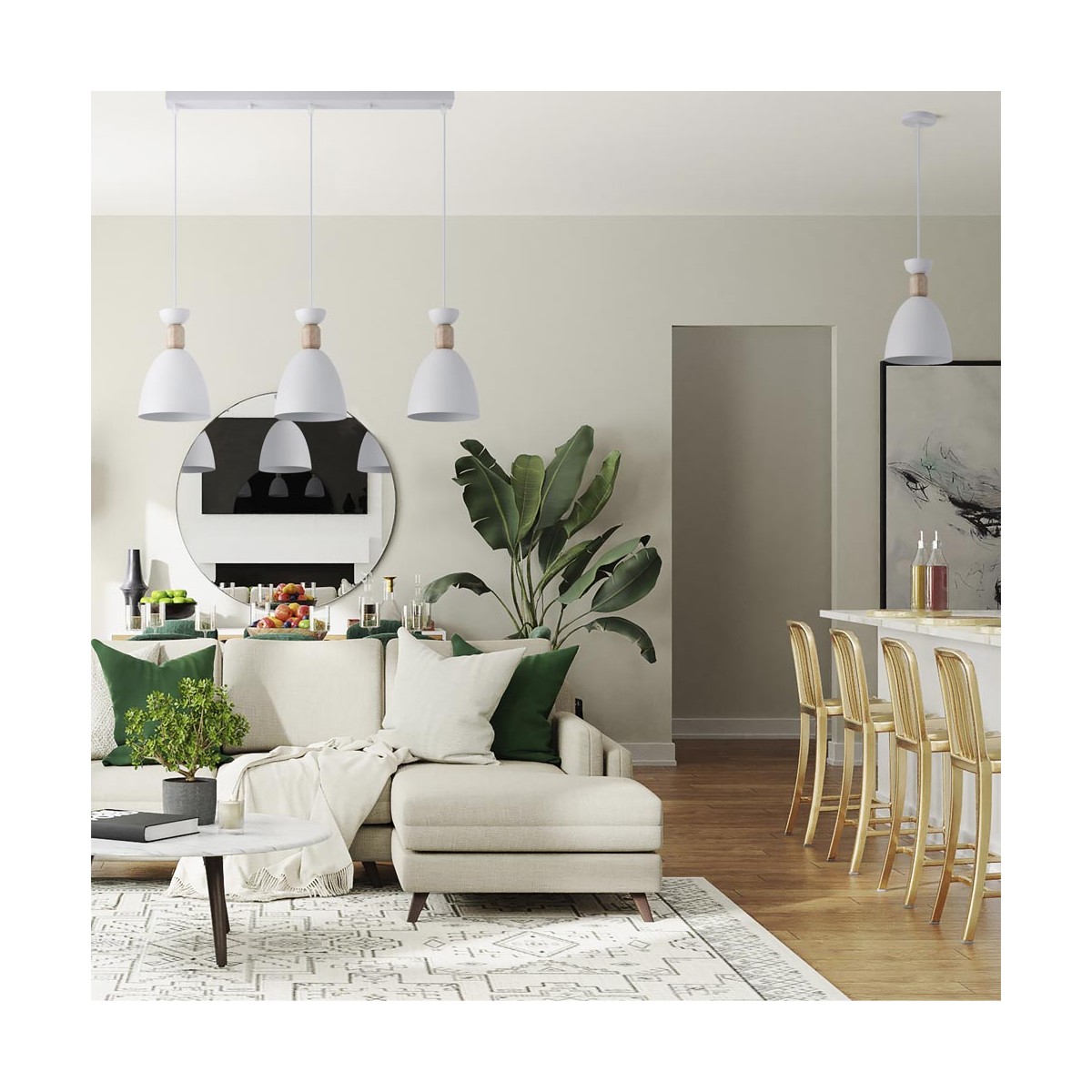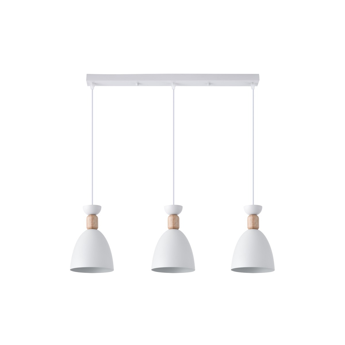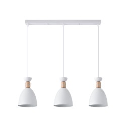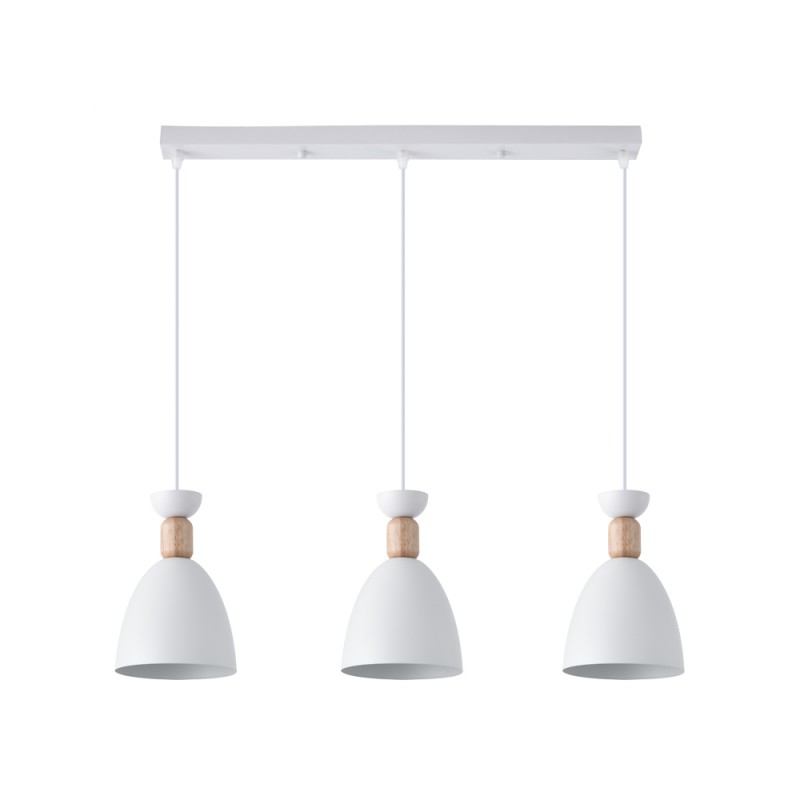 Regleta colgante para salones y cocinas. Regleta de techo con tres pantallas Cloe, perfecta para aportar luz sobre una encimera o una mesa de comedor. Cada pantalla es de metal de color blanca con una decorativa pieza de madera. Colección de iluminación decorativa interior Cloe.