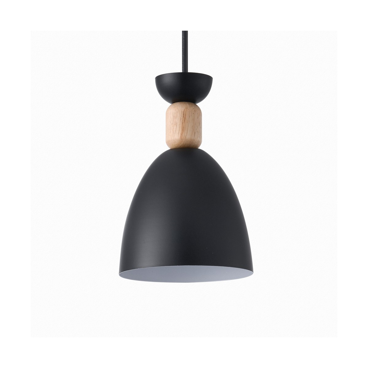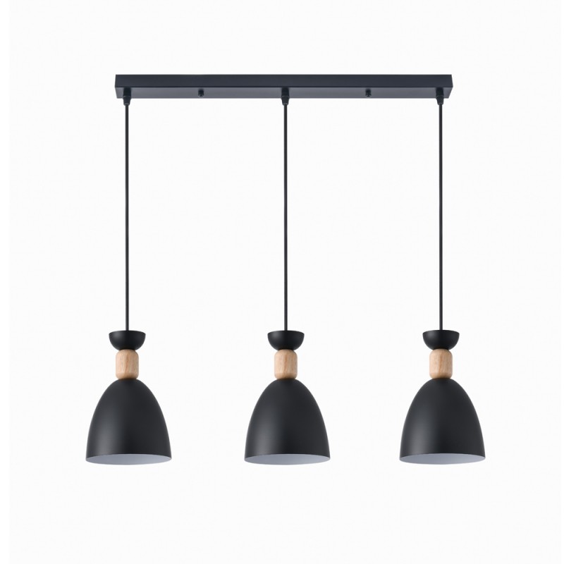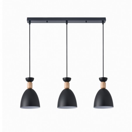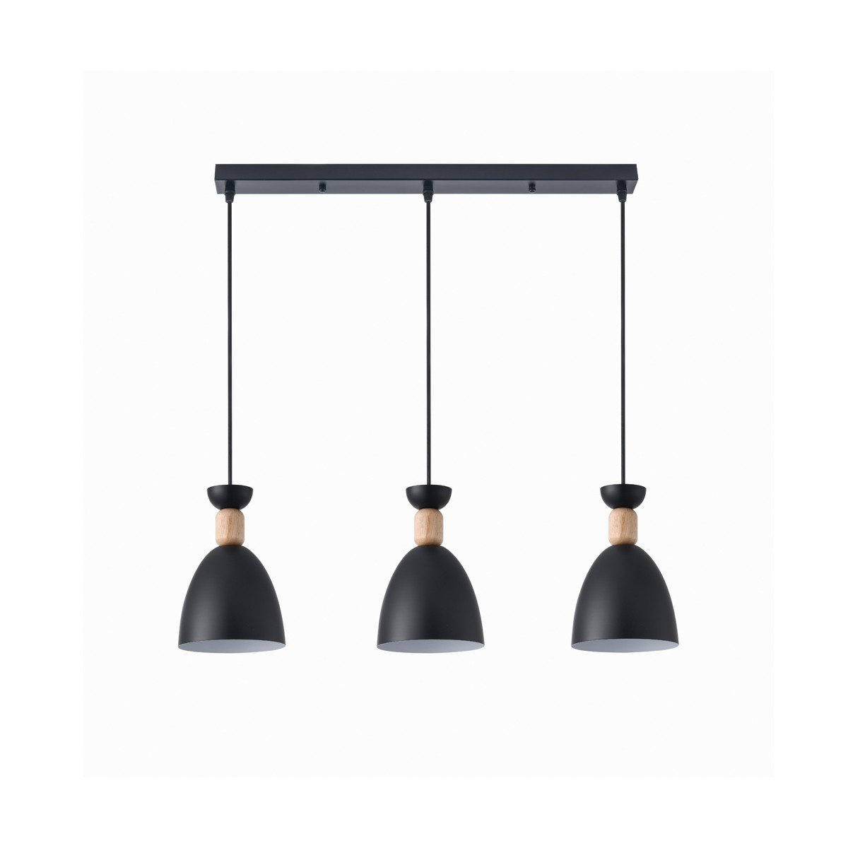 Regleta colgante para salones y cocinas. Regleta de techo con tres pantallas Cloe, perfecta para aportar luz sobre una encimera o una mesa de comedor. Cada pantalla es de metal de color negro con una decorativa pieza de madera. Colección de iluminación decorativa interior Cloe.