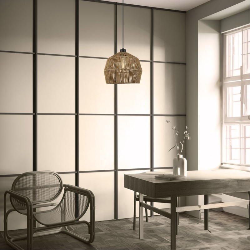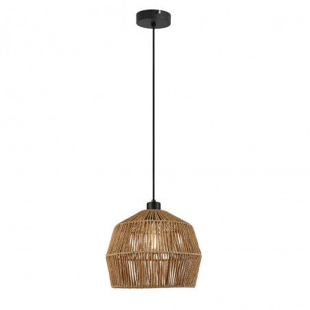 Lámpara colgante boho chic Krabi. Lámpara de techo con pantalla de cuerdas de ratán diseñada para la iluminación decorativa de un espacio de interior. La luz de la bombilla crea un juego de efectos y sombras gracias a las cuerdas que componen la pantalla. Colección de estilo natural Krabi.