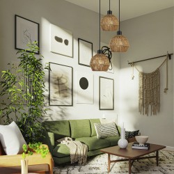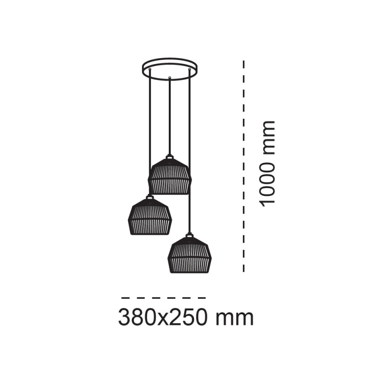 Lámpara colgante boho chic de tres luces Krabi. Lámpara de techo con pantallas de cuerdas de ratán diseñada para la iluminación decorativa de un espacio de interior. La luz de la bombilla crea un juego de efectos y sombras gracias a las cuerdas que componen las pantallas. Colección de estilo natural Krabi.