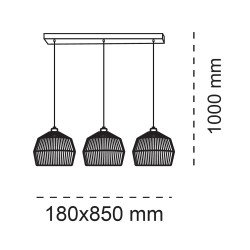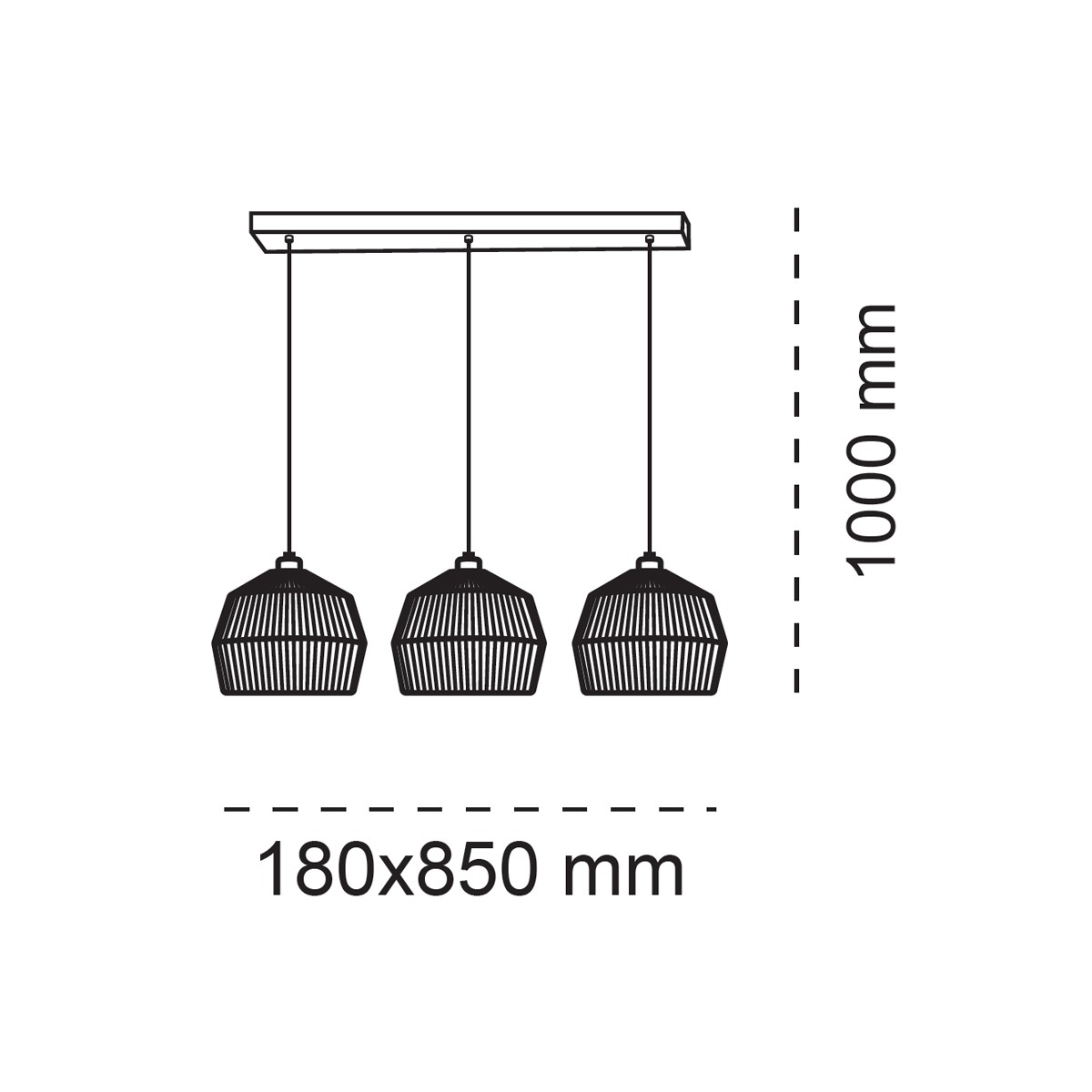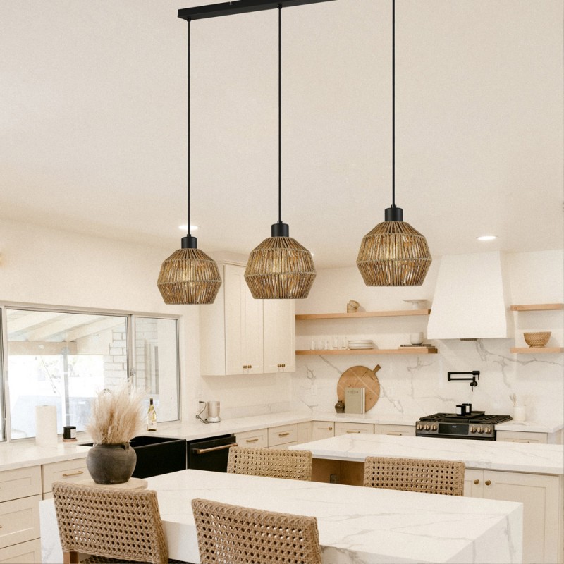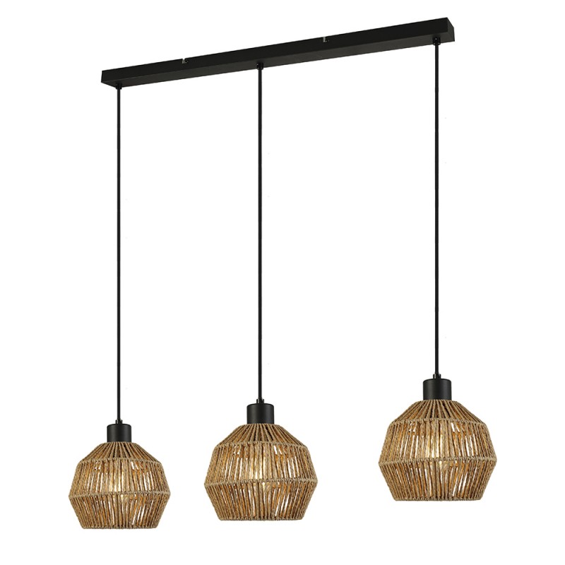 Regleta colgante boho chic de tres luces Krabi. Lámpara de techo con tres pantallas de cuerdas de ratán, ideal para instalar sobre una mesa de comedor o una encimera de cocina. La luz de la bombilla crea un juego de efectos y sombras gracias a las cuerdas que componen las pantallas. Colección de estilo natural Krabi.