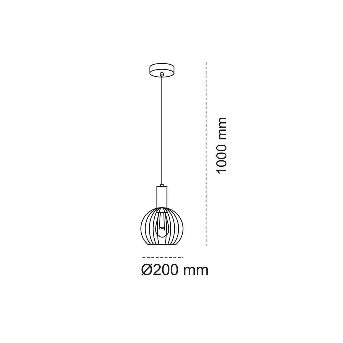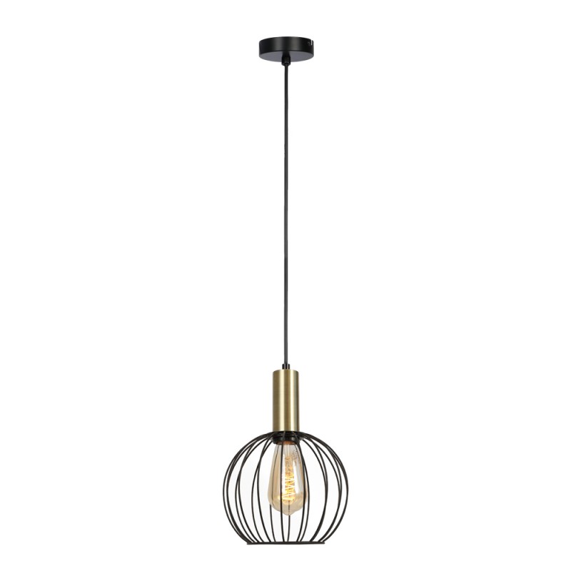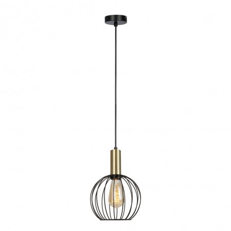Lámpara colgante decorativa de la colección Sofis. Pantalla de varillas metálicas de color negro dejando la bombilla a la vista. El detalle dorado de la parte superior de la pantalla termina de completar el diseño que ofrece esta lámpara. Lámpara colgante para la iluminación decorativa de salones, cocinas y negocios.