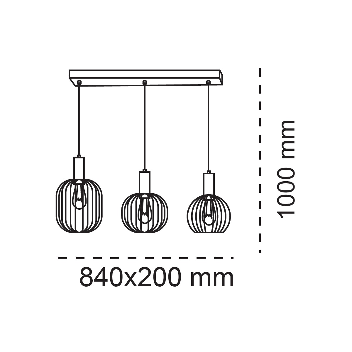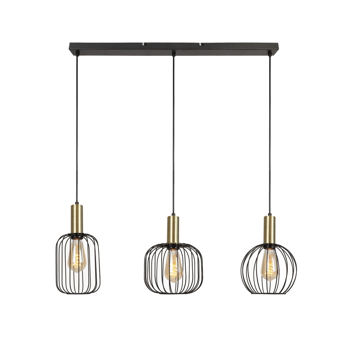 Lámpara colgante para salones y cocinas. Pantallas de varillas metálicas de color negro dejando la bombilla a la vista. El detalle dorado de la parte superior de las pantallas termina de completar el diseño que ofrece esta lámpara. Perfecta para instalar sobre una mesa en el comedor o iluminando una encimera en la cocina. Lámpara colgante para la iluminación decorativa de interior.
