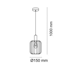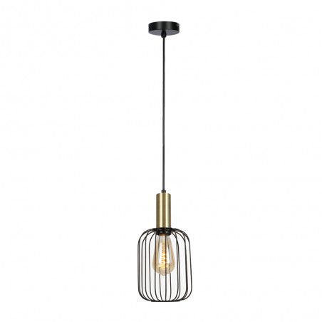 Lámpara colgante decorativa de la colección Sofis. Pantalla de varillas metálicas de color negro dejando la bombilla a la vista. El detalle dorado de la parte superior de la pantalla termina de completar el diseño que ofrece esta lámpara. Lámpara colgante para la iluminación decorativa de salones, cocinas y negocios.