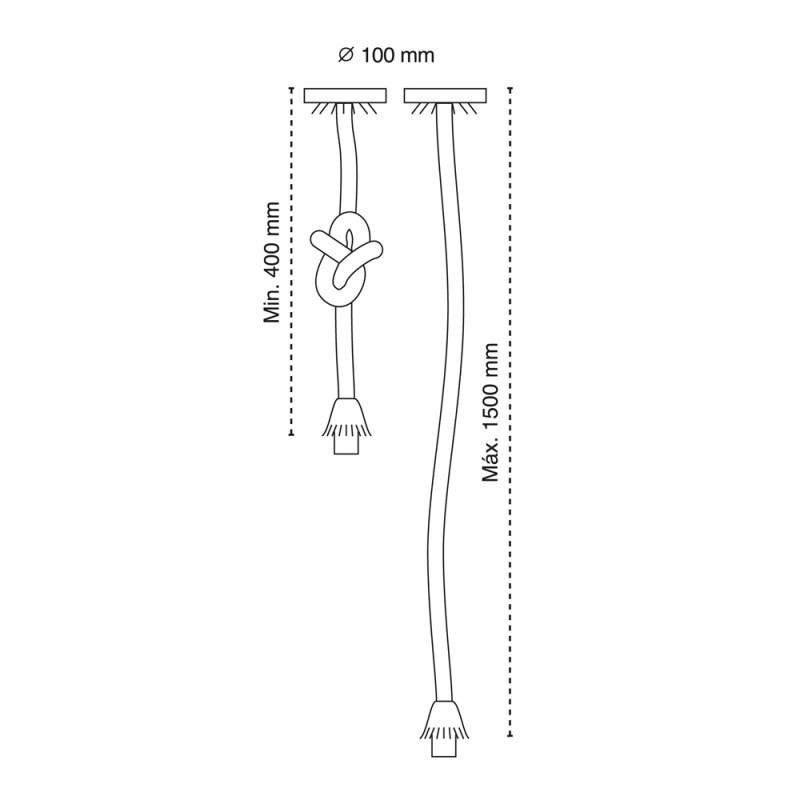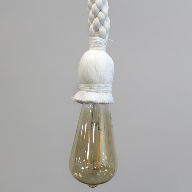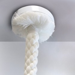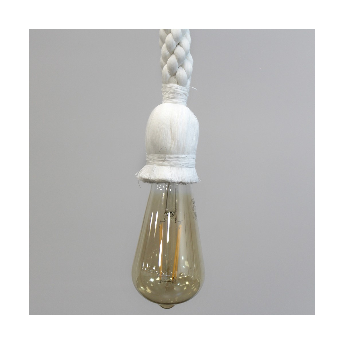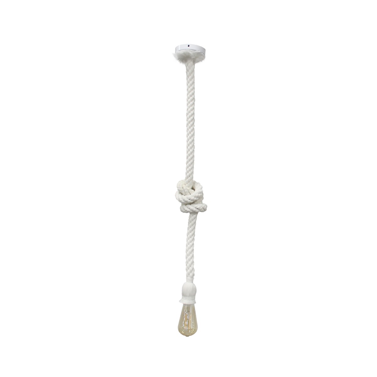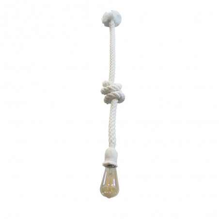 Lámpara colgante de cuerda perfecta para crear ambientes retro-vintage. Puedes anudar la cuerda con diferentes nudos para conseguir diferentes efectos. Cuerda, portalámparas y florón de color blanco. Una lámpara colgante ideal para locales comerciales o habitaciones de estilo industrial o rústico.