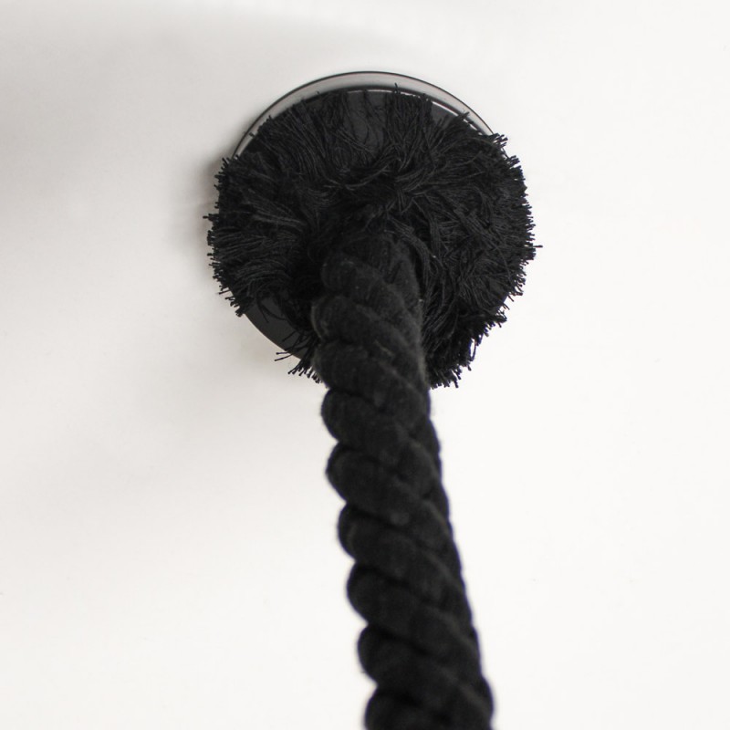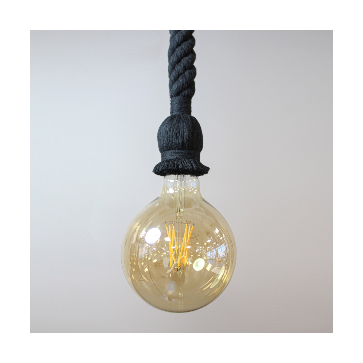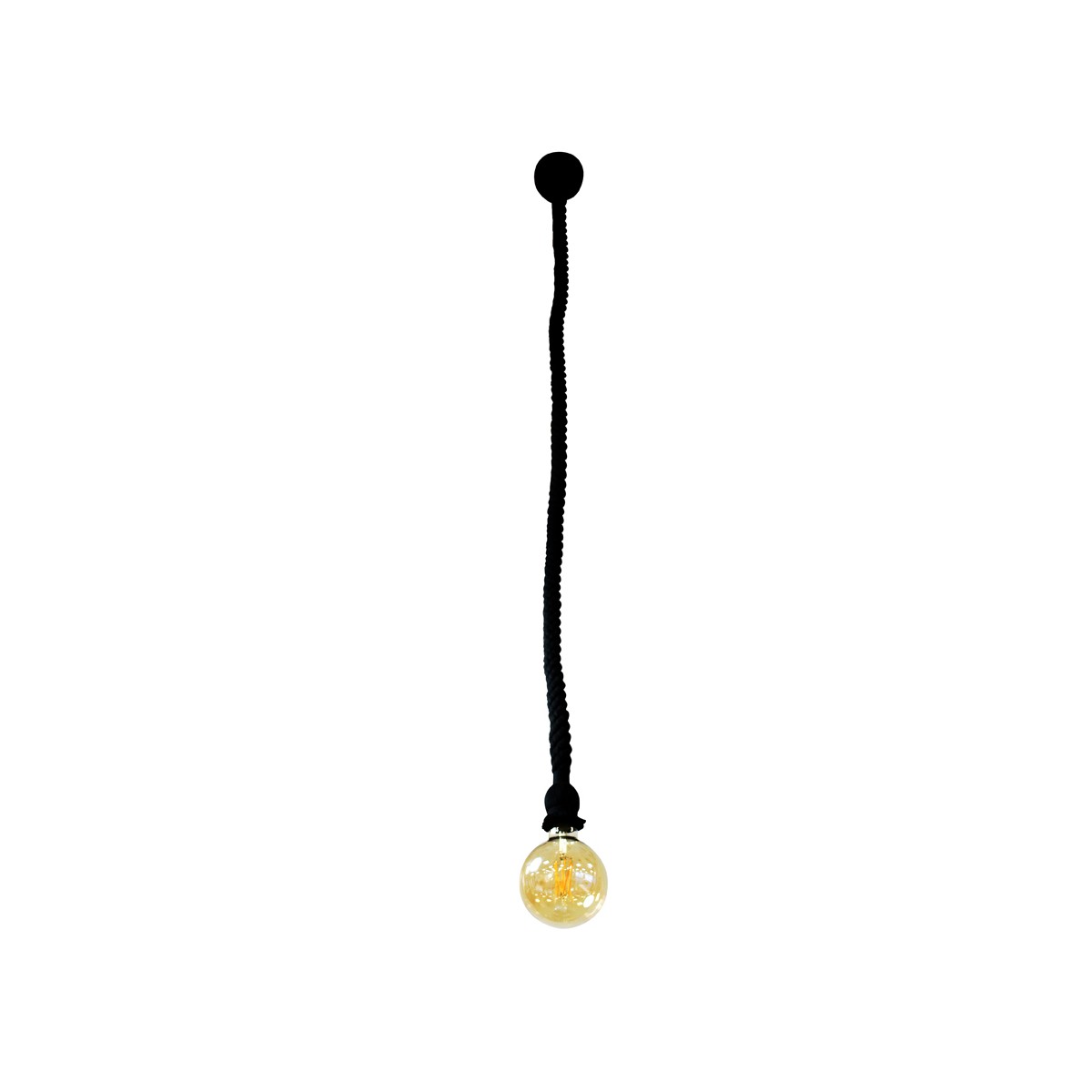 Lámpara colgante de cuerda perfecta para crear ambientes retro-vintage. Puedes anudar la cuerda con diferentes nudos para conseguir diferentes efectos. Cuerda, portalámparas y florón de color negro. Una lámpara colgante ideal para locales comerciales o habitaciones de estilo industrial o rústico.