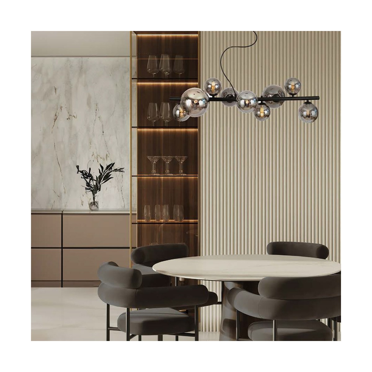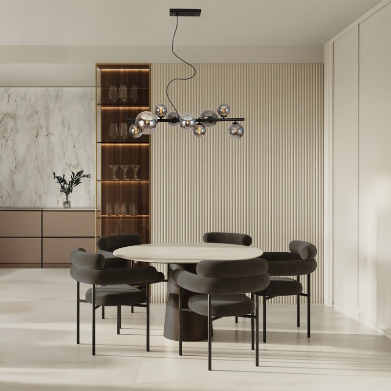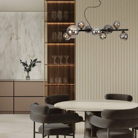 Lámpara colgante de nueve luces Boston. Lámpara de techo para la iluminación de una mesa de comedor o una encimera isla de cocina. Diseño nórdico combinando metal de color negro con nueve tulipas de cristal fumé. Colección Boston.