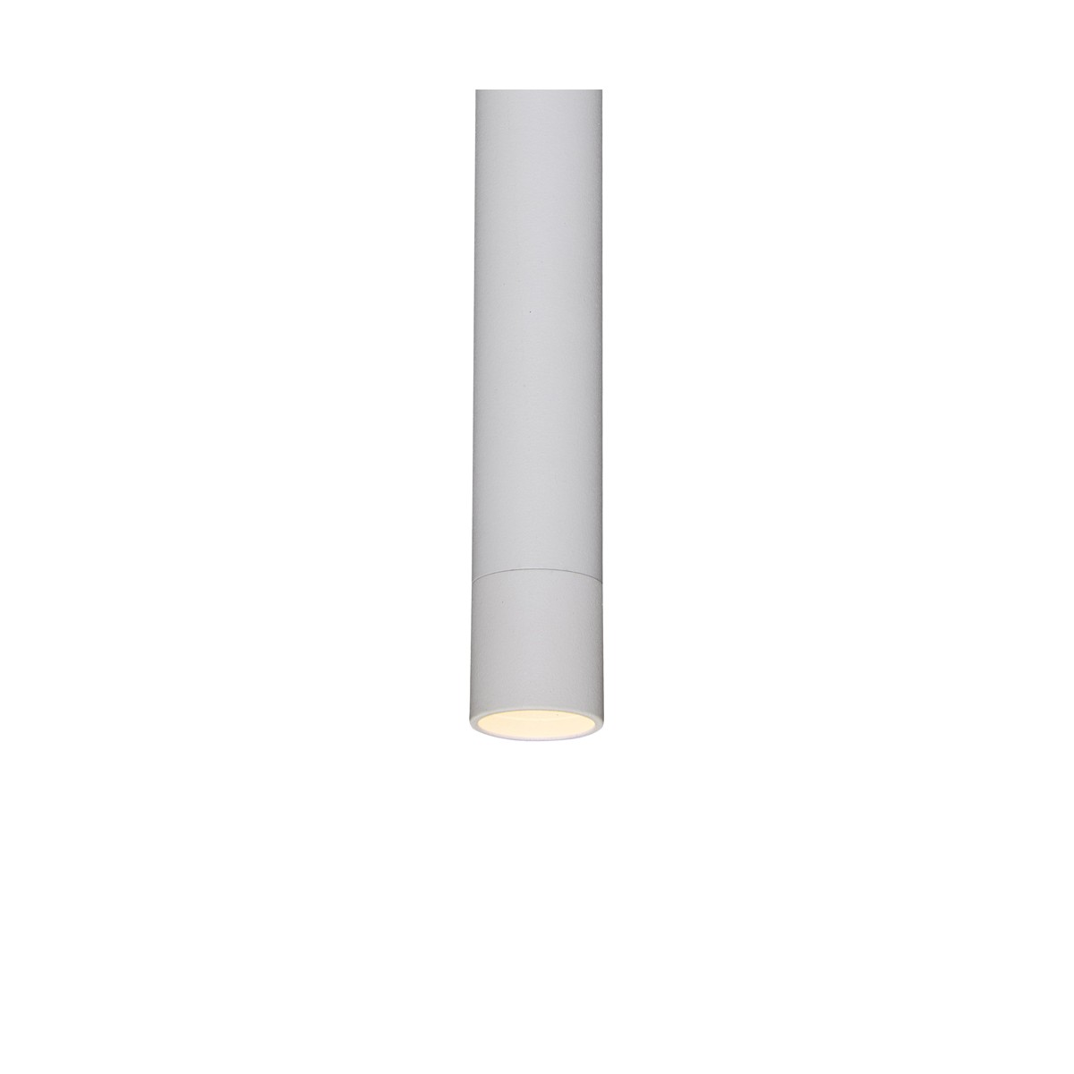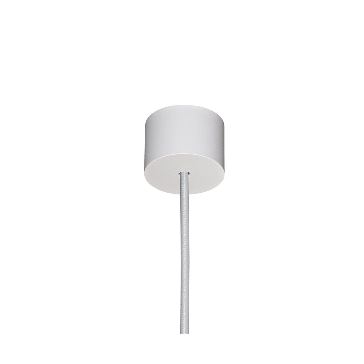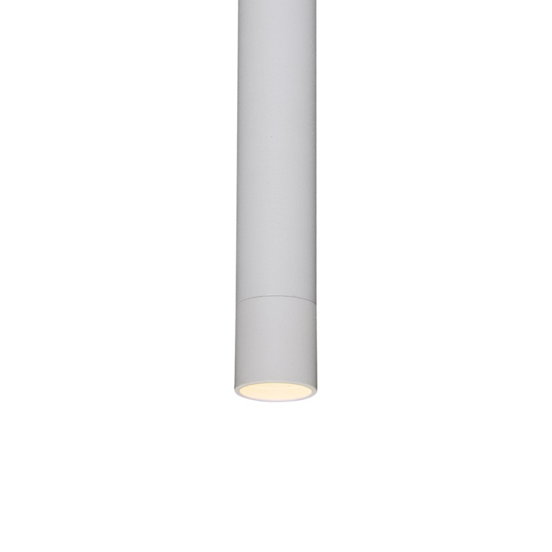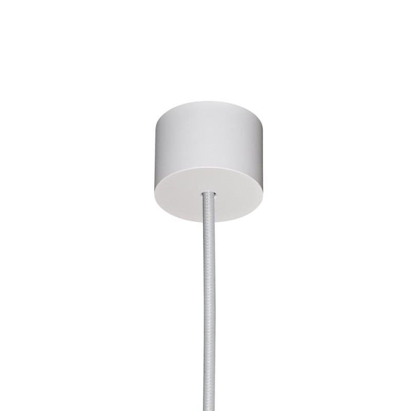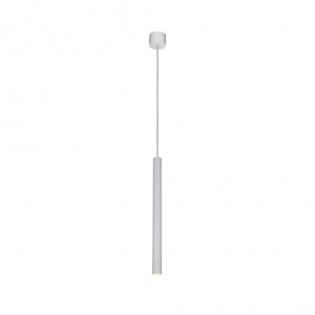 Lámpara colgante tubular de color blanco. Lámpara de techo con punto de luz focalizado ideal para aportar iluminación sobre encimeras de cocina, barras de bar o mesas de comedor. Fabricada en aluminio de color blanco. Cable textil blanco.