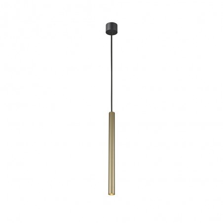 Lámpara colgante tubular dorada Slim. Lámpara de techo con punto de luz focalizado ideal para aportar iluminación sobre encimeras de cocina, barras de bar o mesas de comedor. Fabricada en aluminio acabado dorado. Cable textil negro.