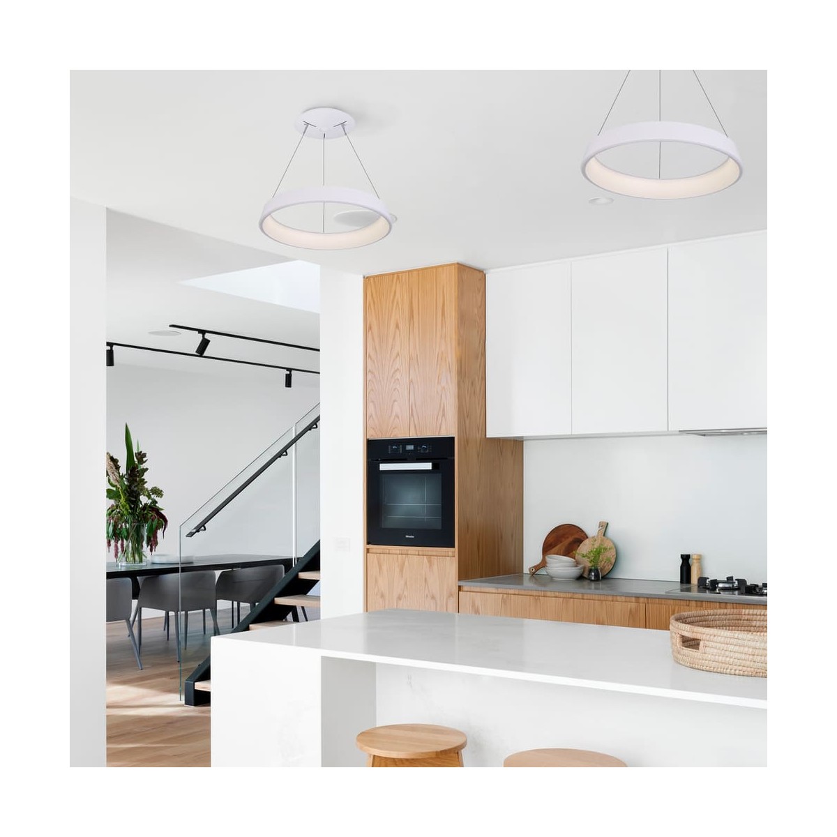 Lámpara de techo colgante con luz led en tono cálido de 3000K. La altura de la lámpara puede ajustarse fácilmente con un sencillo sistema escondido en el florón. Tanto el florón como el aro de la lámpara están fabricados en aluminio con un difusor acrílico que permite pasar la luz reduciendo el índice de deslumbramiento. Puedes encontrar la lámpara en tres acabados diferentes; blanco, café y plata.