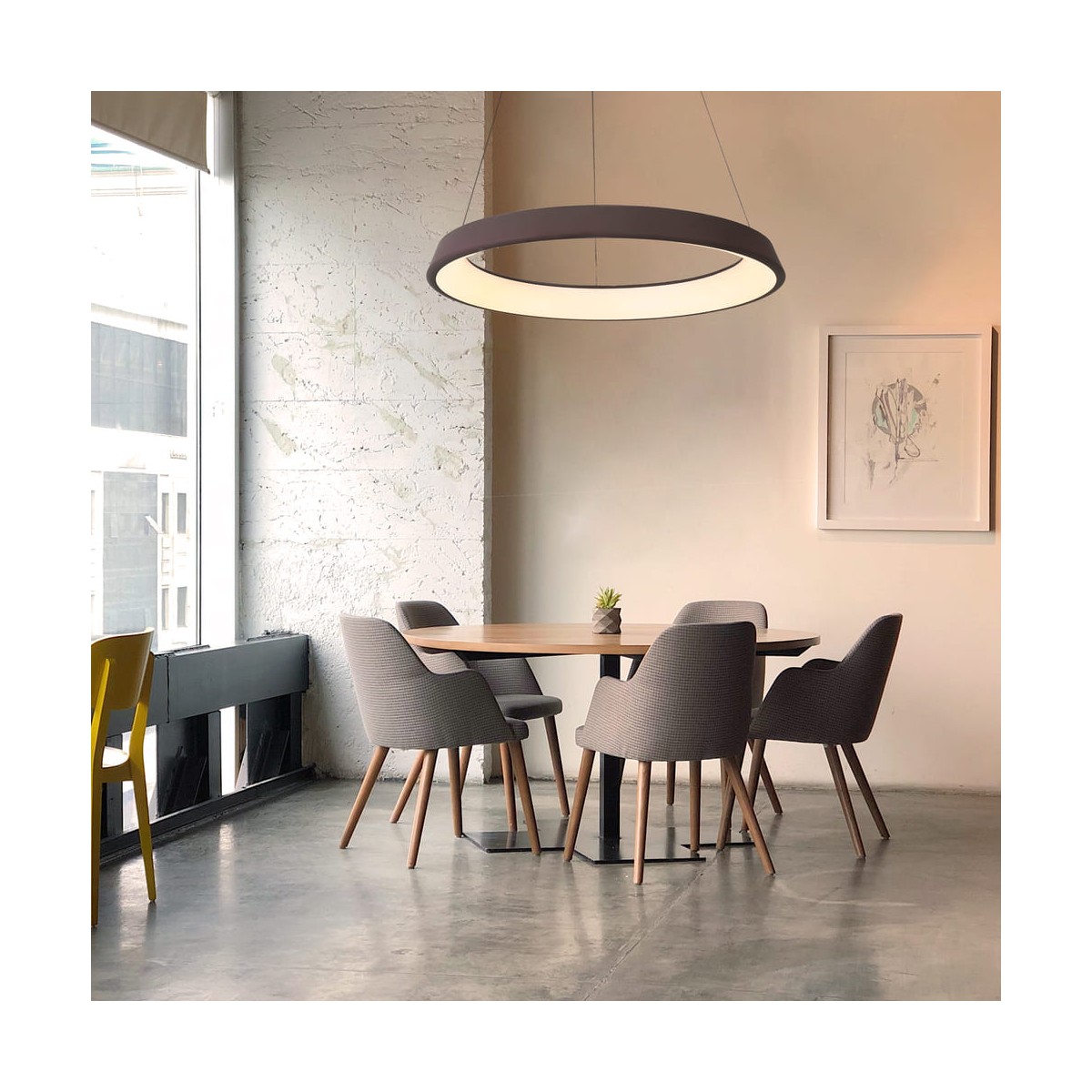 Lámpara de techo colgante con luz led en tono cálido de 3000K. La altura de la lámpara puede ajustarse fácilmente con un sencillo sistema escondido en el florón. Tanto el florón como el aro de la lámpara están fabricados en aluminio con un difusor acrílico que permite pasar la luz reduciendo el índice de deslumbramiento. Puedes encontrar la lámpara en tres acabados diferentes; blanco, café y plata.