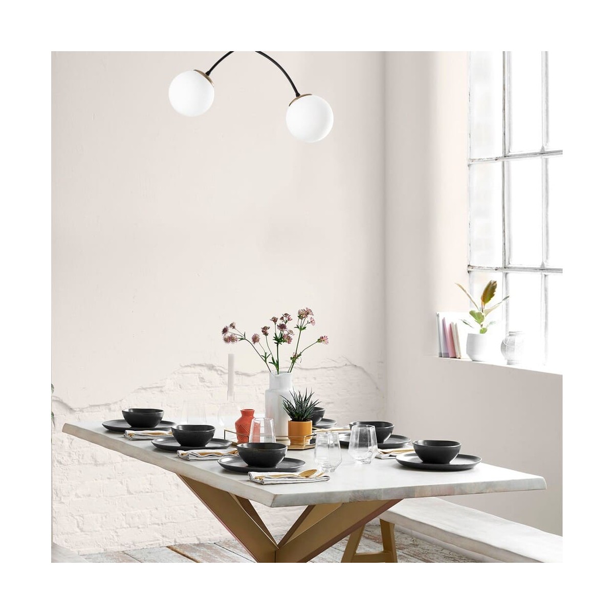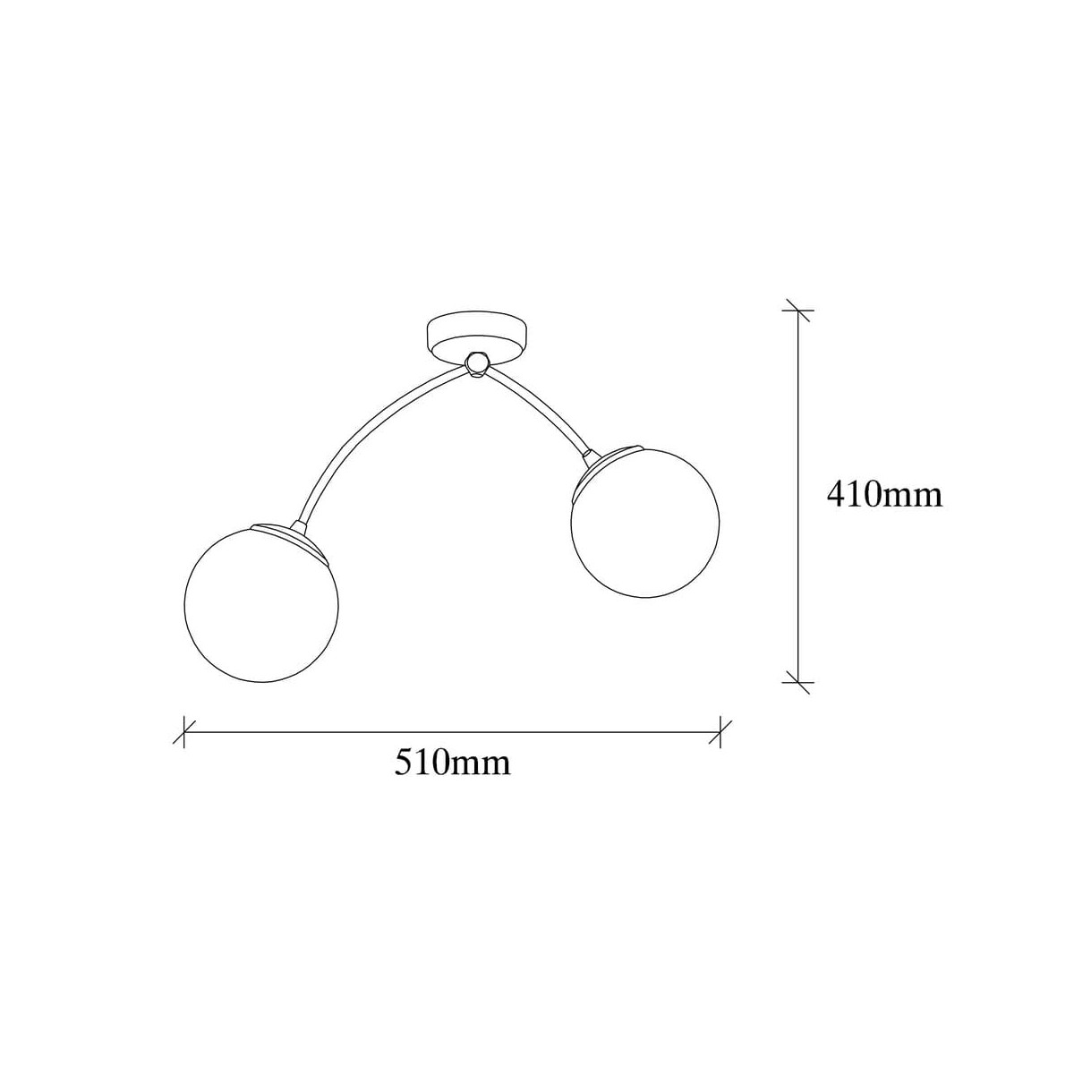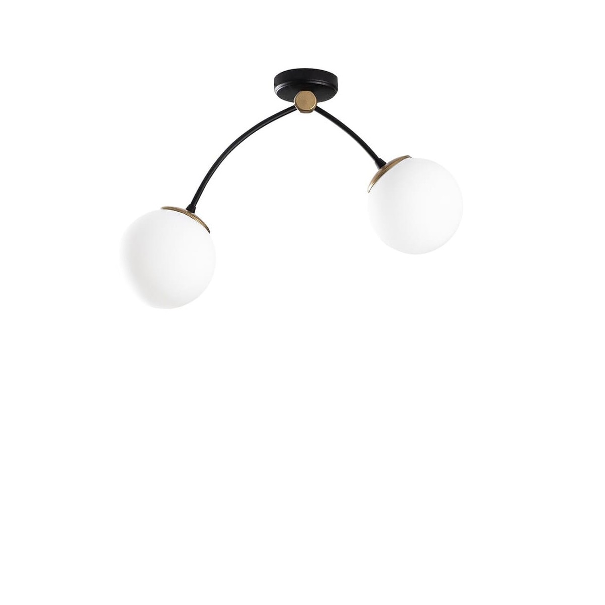 Lámpara de techo decorativa con brazos metálicos negros con dos luces y tulipas de cristal blanco mate. La lámpara mide 41cm de alto. Funciona con bombillas E27, no incluidas.