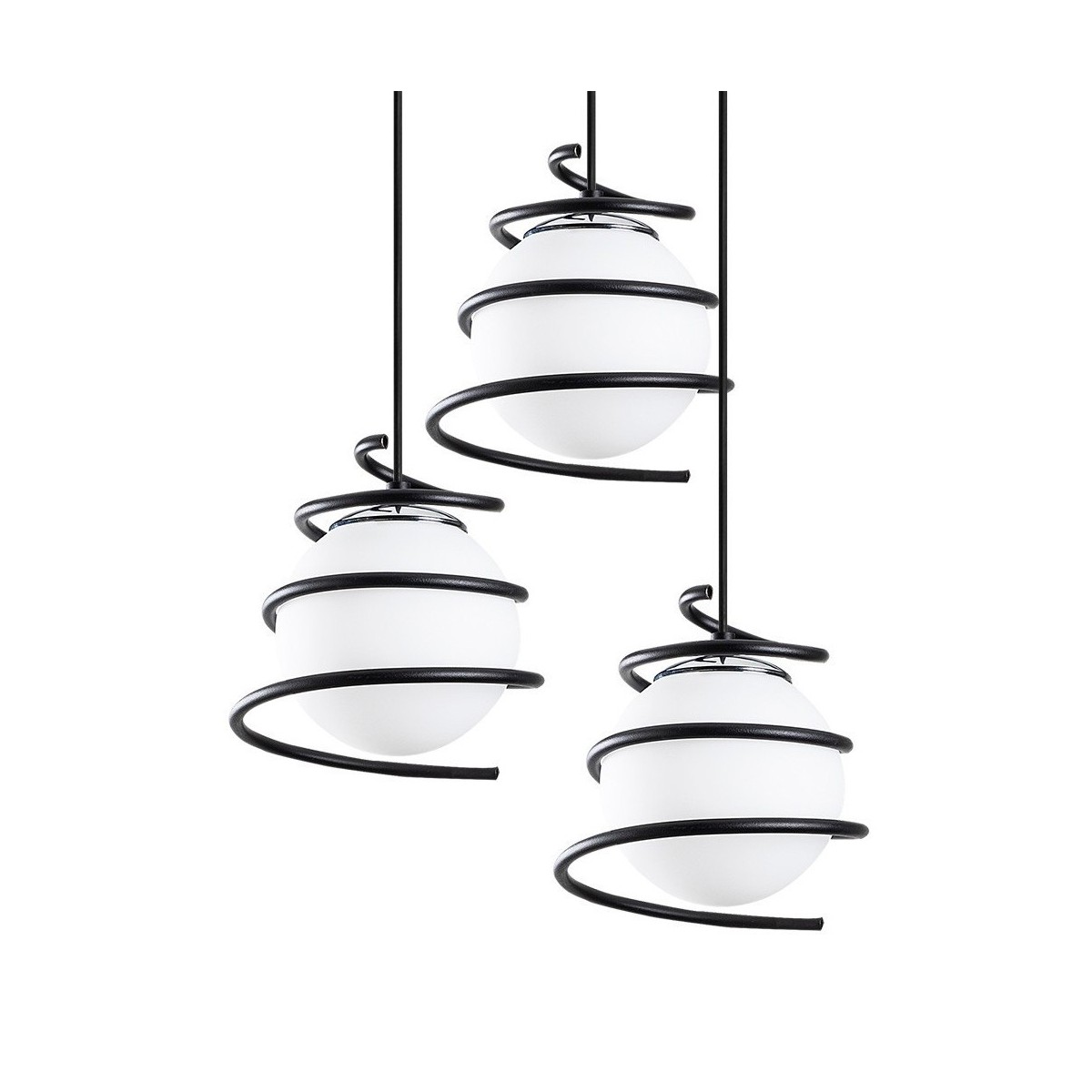 Lámpara de techo colgante decorativa con tres luces y tulipas de cristal blanco mate. Esta lámpara permite regular la altura de las luces de 36 a 116 cm de alto, personalizando el diseño final. Funciona con bombillas E27, no incluidas.