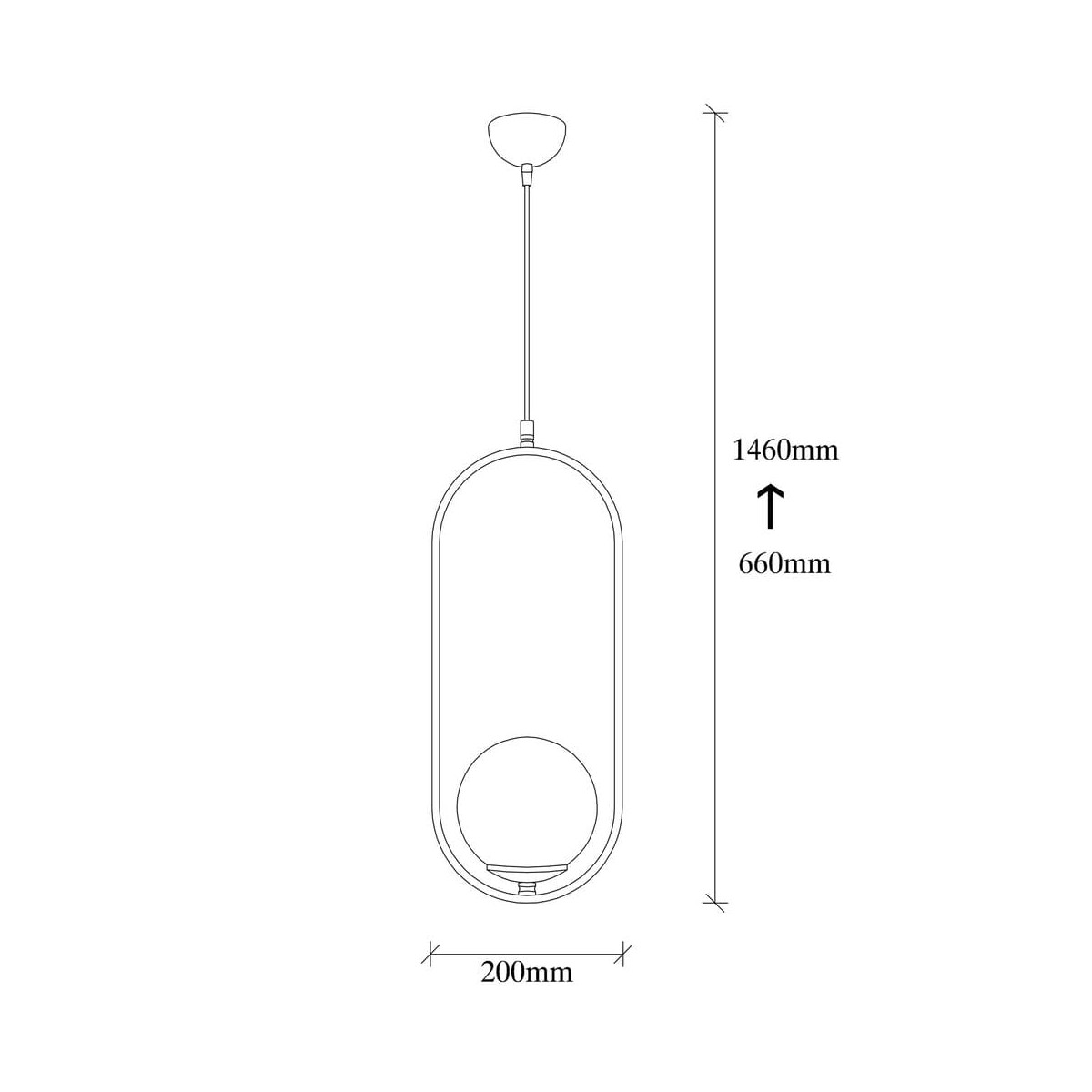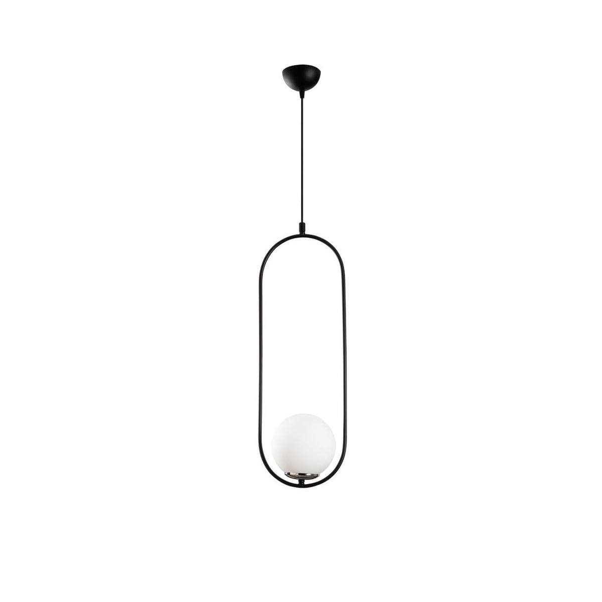 Lámpara decorativa colgante con un sencillo diseño geométrico de una luz compuesto por un anillo metálico lacado en negro de 60 cm y una tulipa de cristal blanco mate. Puede ajustarse la altura de la luz regulando la largura del cable dejando solo el aro metálico o una largura máxima de 146 cm. Apta para bombillas E27.
