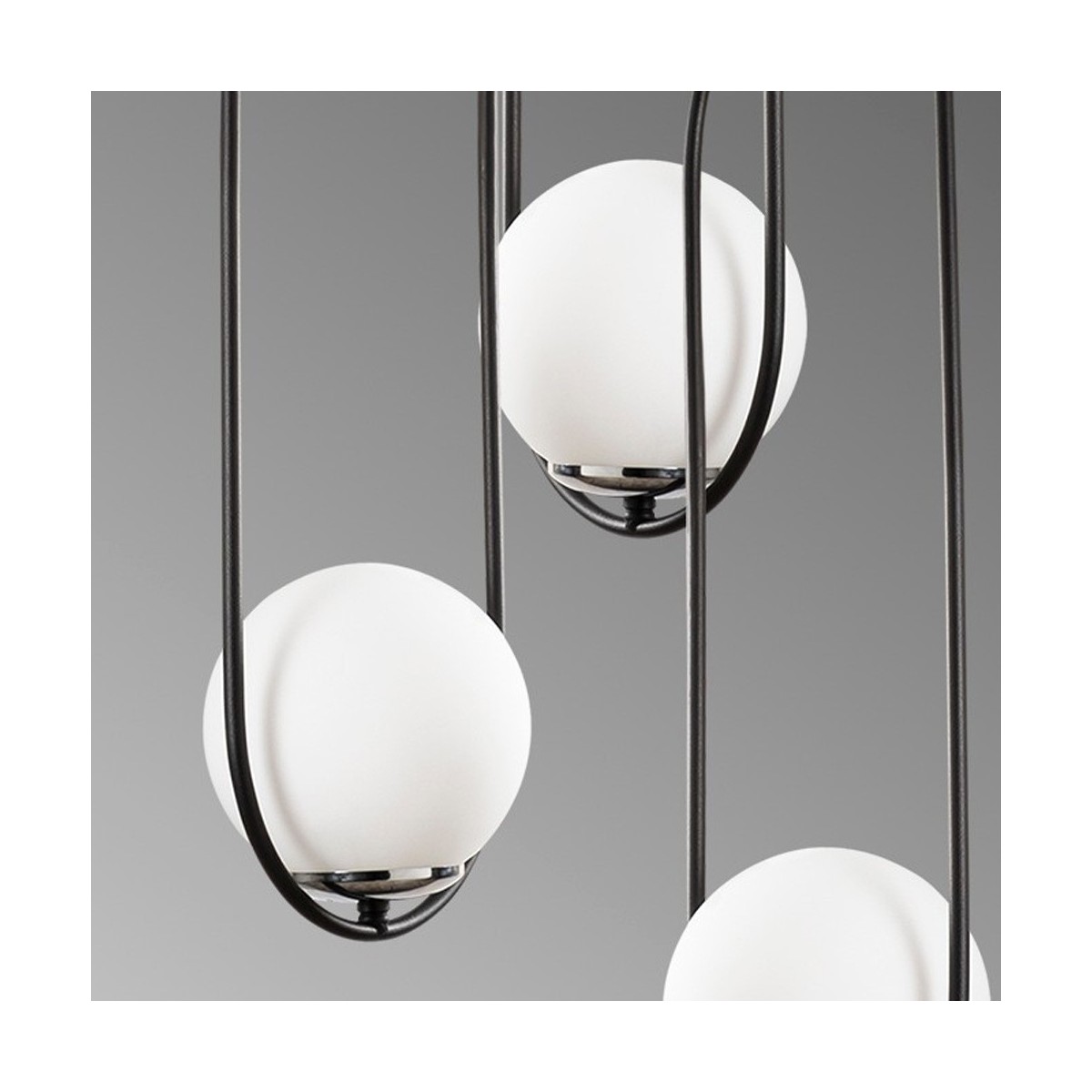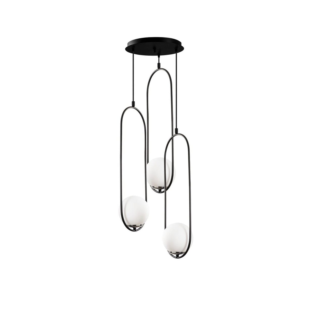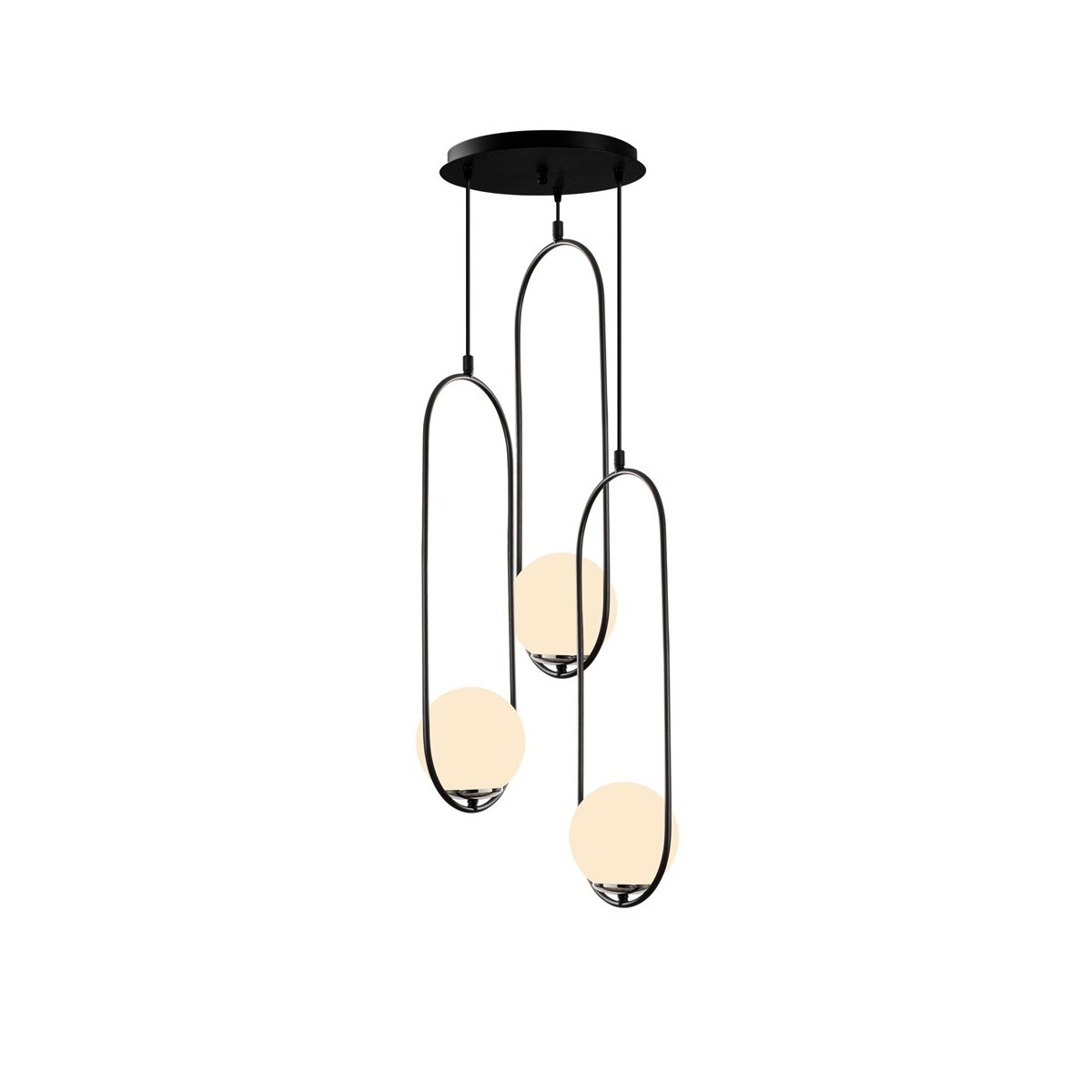 Lámpara decorativa con diseño geométrico de de tres luces colgante y florón de techo redondo. Las luces estan compuestas por un anillo metálico lacado en negro de 60 cm y una tulipa de cristal blanco mate. Puede ajustarse la altura de la luz regulando la largura del cable dejando solo el aro metálico o una largura máxima de 146 cm. Apta para bombillas E27.