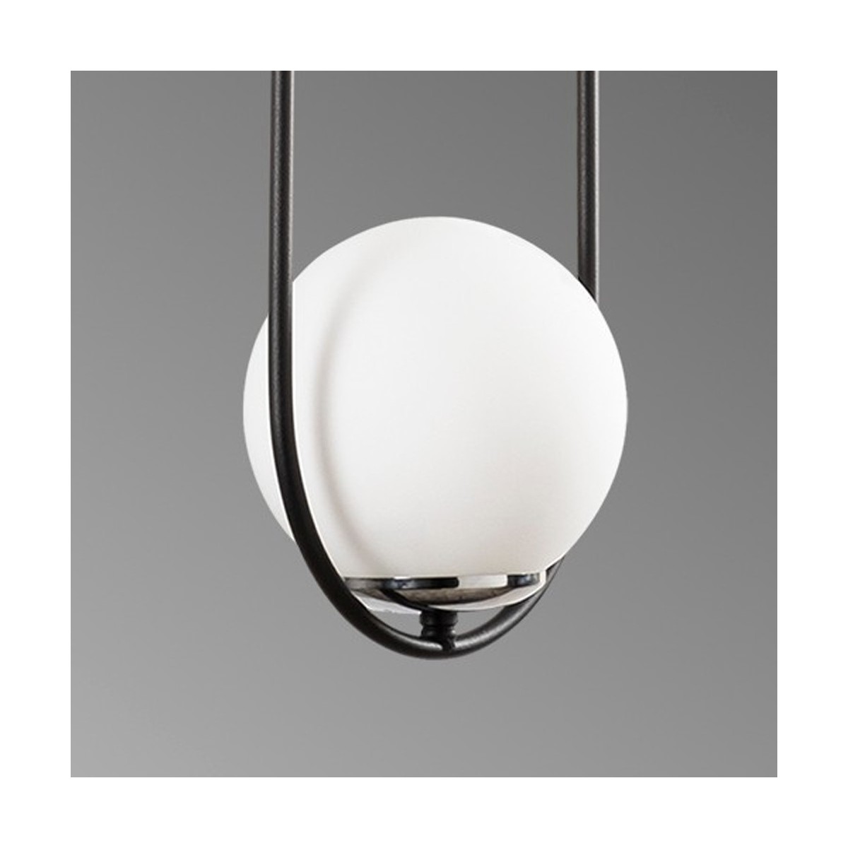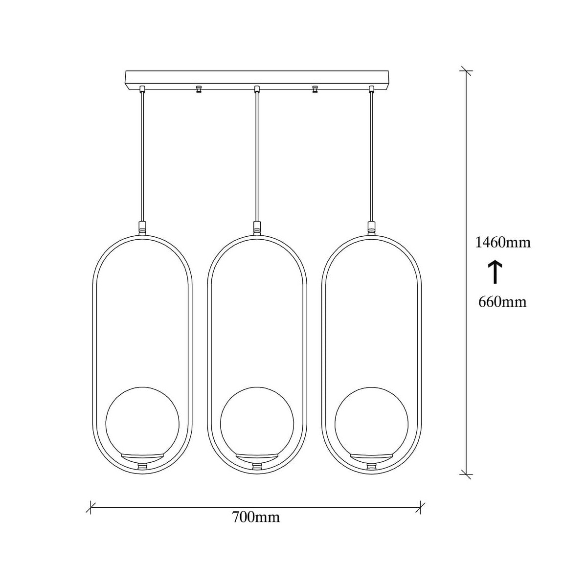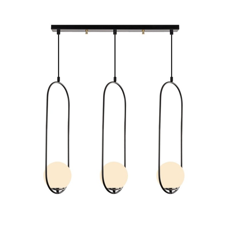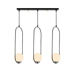 Lámpara decorativa con diseño geométrico de de tres luces colgantes lineales. Las luces estan compuestas por un anillo metálico lacado en negro de 60 cm y una tulipa de cristal blanco mate. Puede ajustarse la altura de la luz regulando la largura del cable dejando solo el aro metálico o una largura máxima de 146 cm. Apta para bombillas E27.