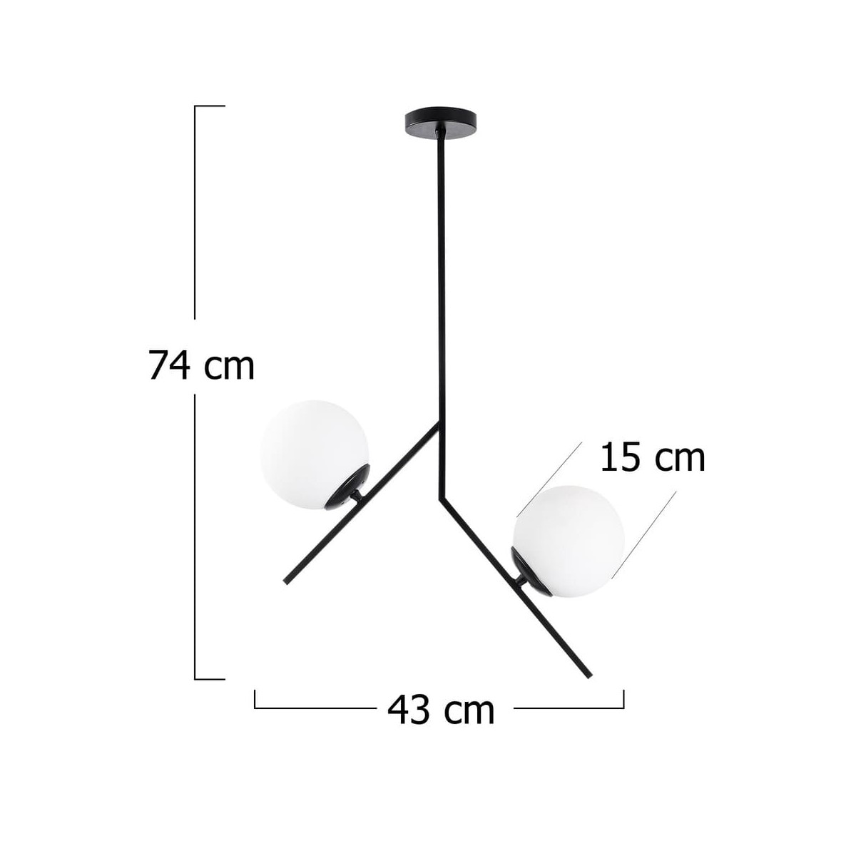 Lámpara de techo colgante decorativa de dos luces y tulipa de cristal blanco matede 74 cm de altura. Diseño moderno con cuerpo lacado en negro. Para bombillas E27, no incluida.