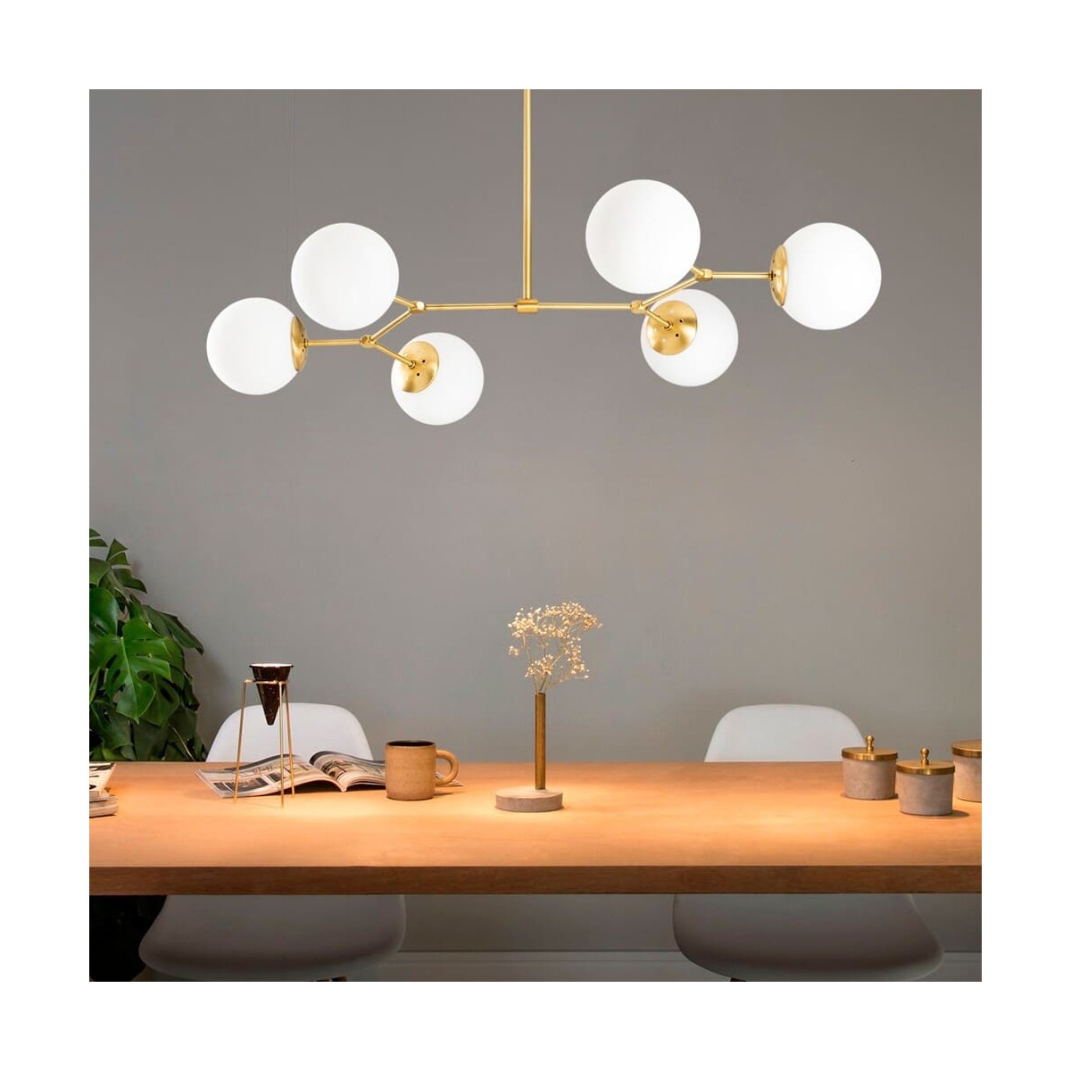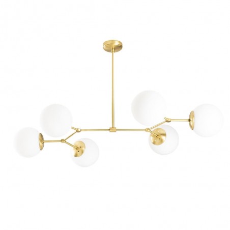 Lámpara de techo colgante de seis luces, con cuerpo metálico lacado dorado y tulipas de cristal blanco mate. Está lámpara tiene un estilo sencillo y moderno, hacíendola perfecta para amplios espacios modernos que necesitan aportar luz adicional a la estancia.