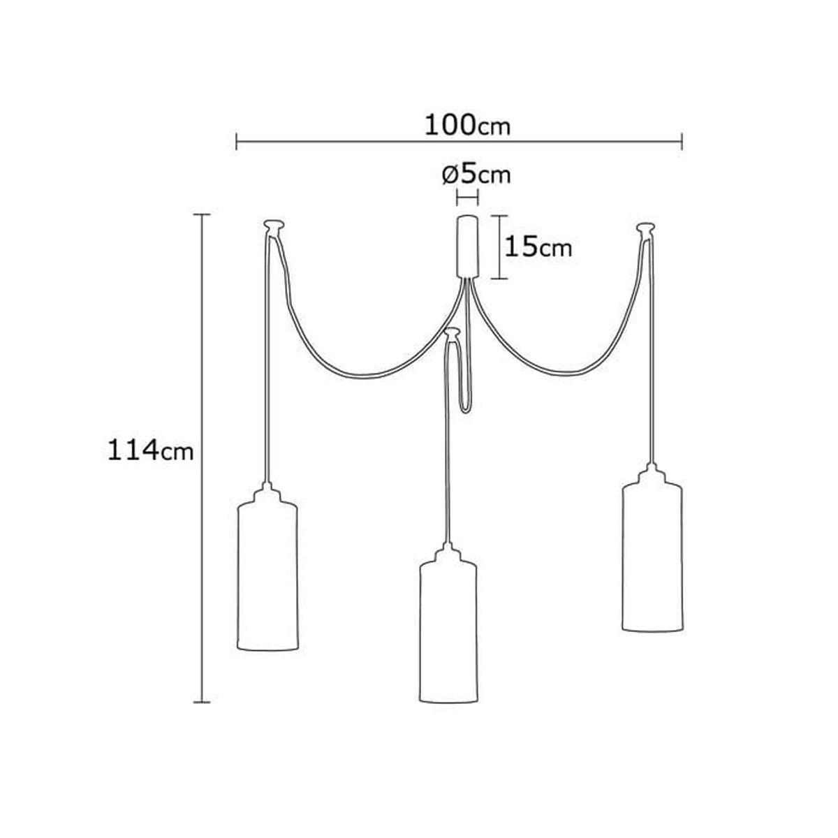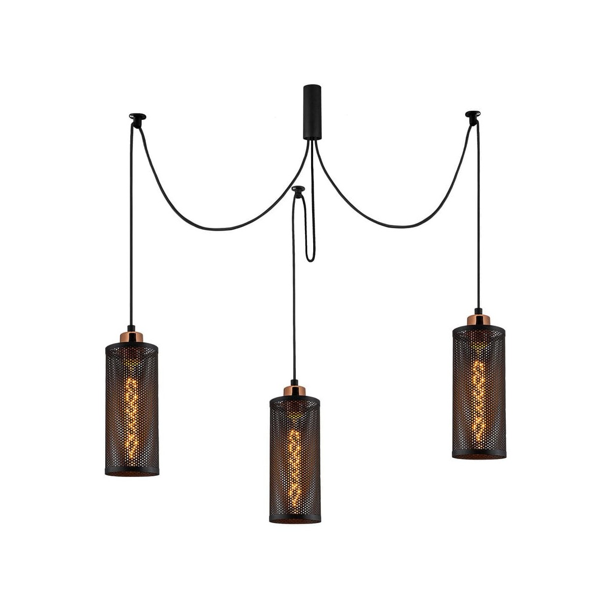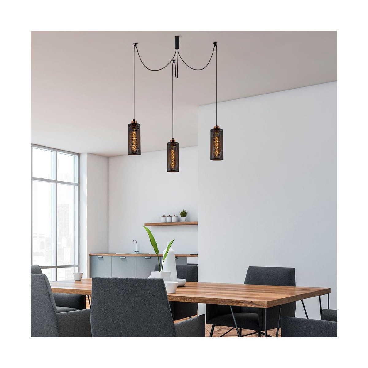 Lámpara de techo decorativa con tres luces de estilo industrial que pueden regularse en altura y desplazar el punto de luz con un sujetacables en el techo, gracias a su cable extralargo de 180cm. La pantalla metálica de cada una de las bombillas imita a una jaula. Para bombillas led E27 no incluida.