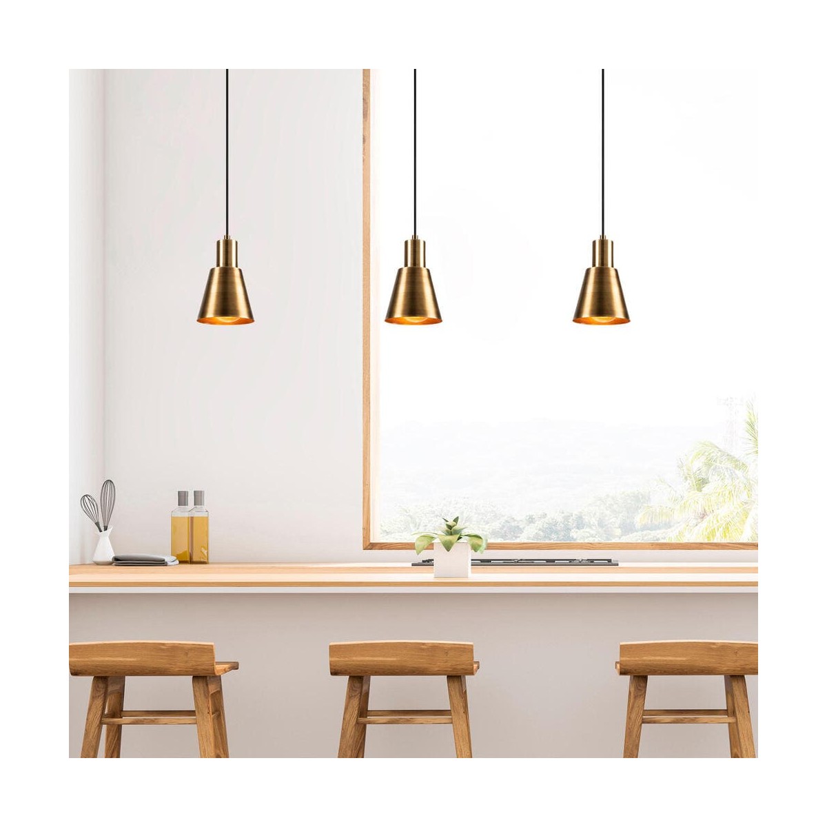 Lámpara decorativa colgante de techo de estilo industrial con estructura metálica en oro viejo. La largura del cable puede ajustarse hasta los 90 cm de largo adaptándose a los espacios y necesidades de cada estancia de tu hogar. Bombilla E27, no incluida.