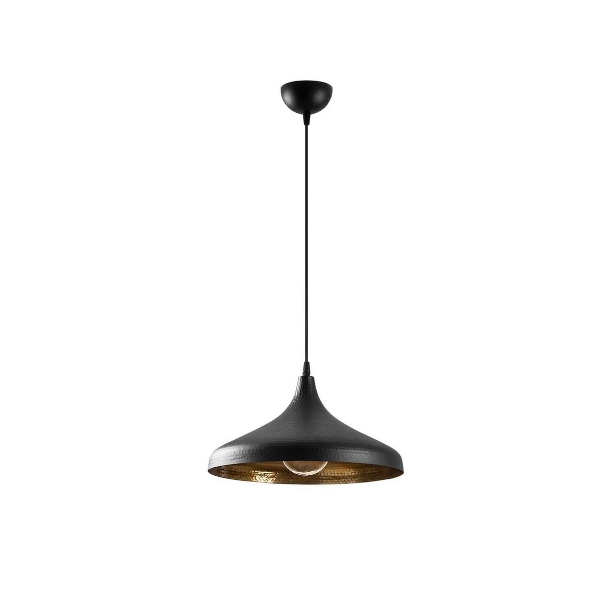 Lámpara decorativa colgante de techo con largura de cable ajustable. Pantalla metálica negro mate con el interior en dorado. Permite crear diferentes composiciones de iluminación decorativa, adaptándose a diferentes espacios, al ajustar la altura de la lámpara. Para bombillas E27, no incluidas.