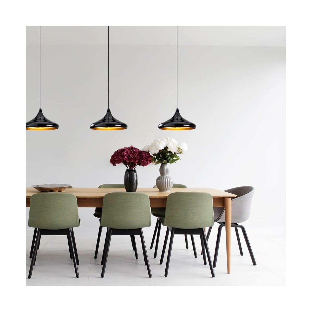 Lámpara decorativa colgante de techo con largura de cable ajustable hasta 90cm. Pantalla metálica negro brillo con el interior en dorado. Permite crear diferentes composiciones de iluminación decorativa, adaptándose a diferentes espacios, al ajustar la altura de la lámpara. Para bombillas E27, no incluidas.