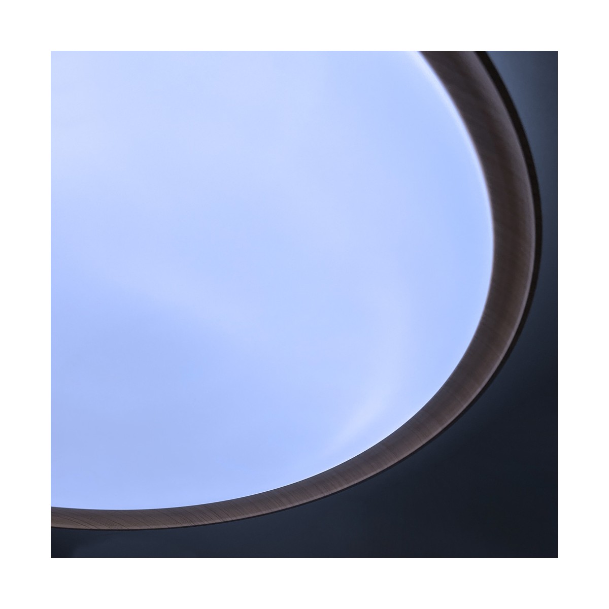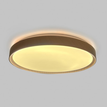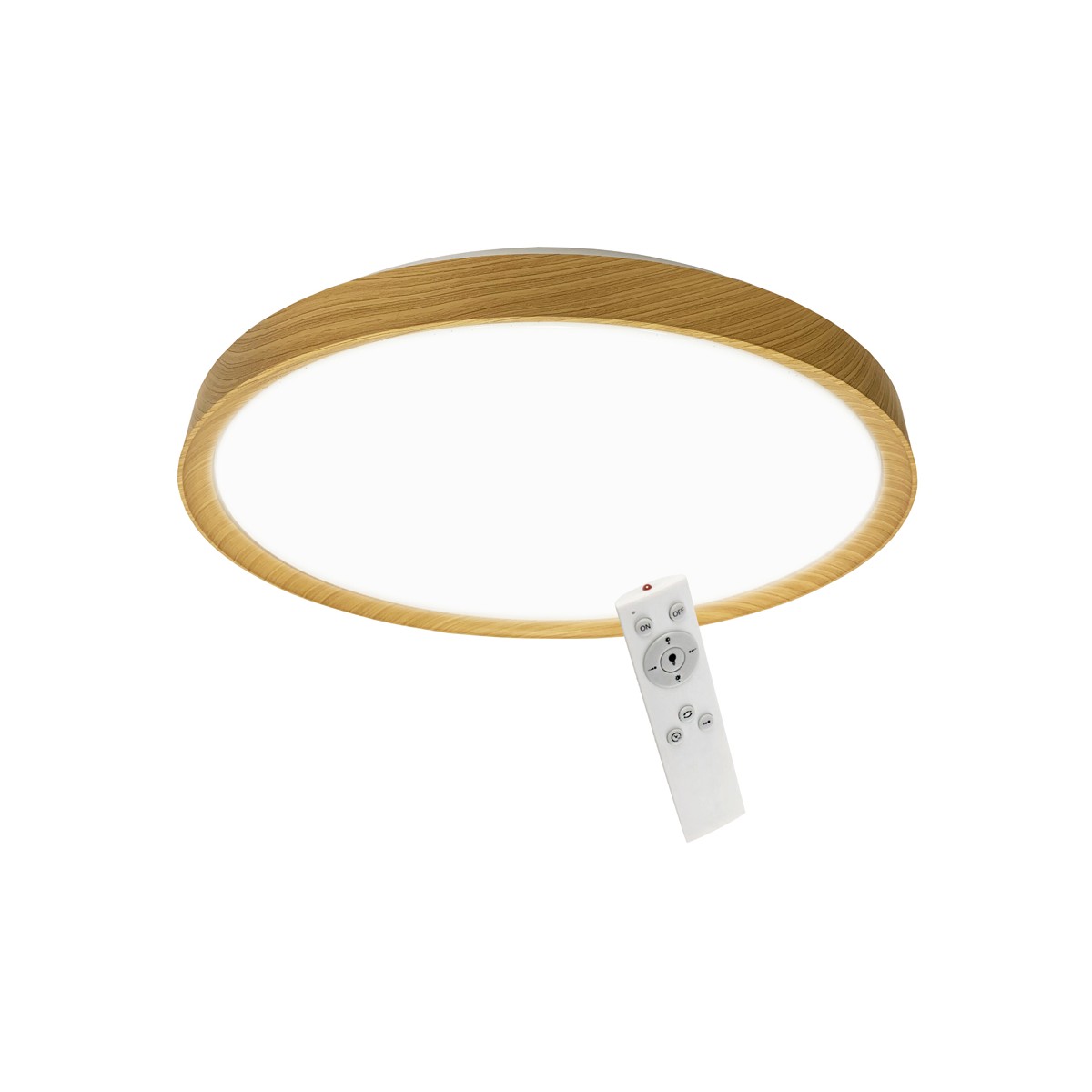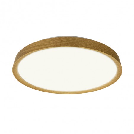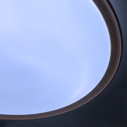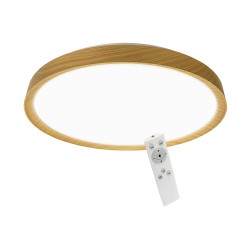 Plafón de techo LED Cres con tres temperaturas de color. Plafón circular con un decorativo efecto madera ideal para colocar en estancias con muebles de madera o colores blanco y negros. Amplio difusor el cual permite proyectar la luz de manera homogénea hacia abajo. El plafón incluye mando a distancia para controlar la iluminación y adaptarla a nuestras necesidades, regulando la intensidad o variando el tono de color.