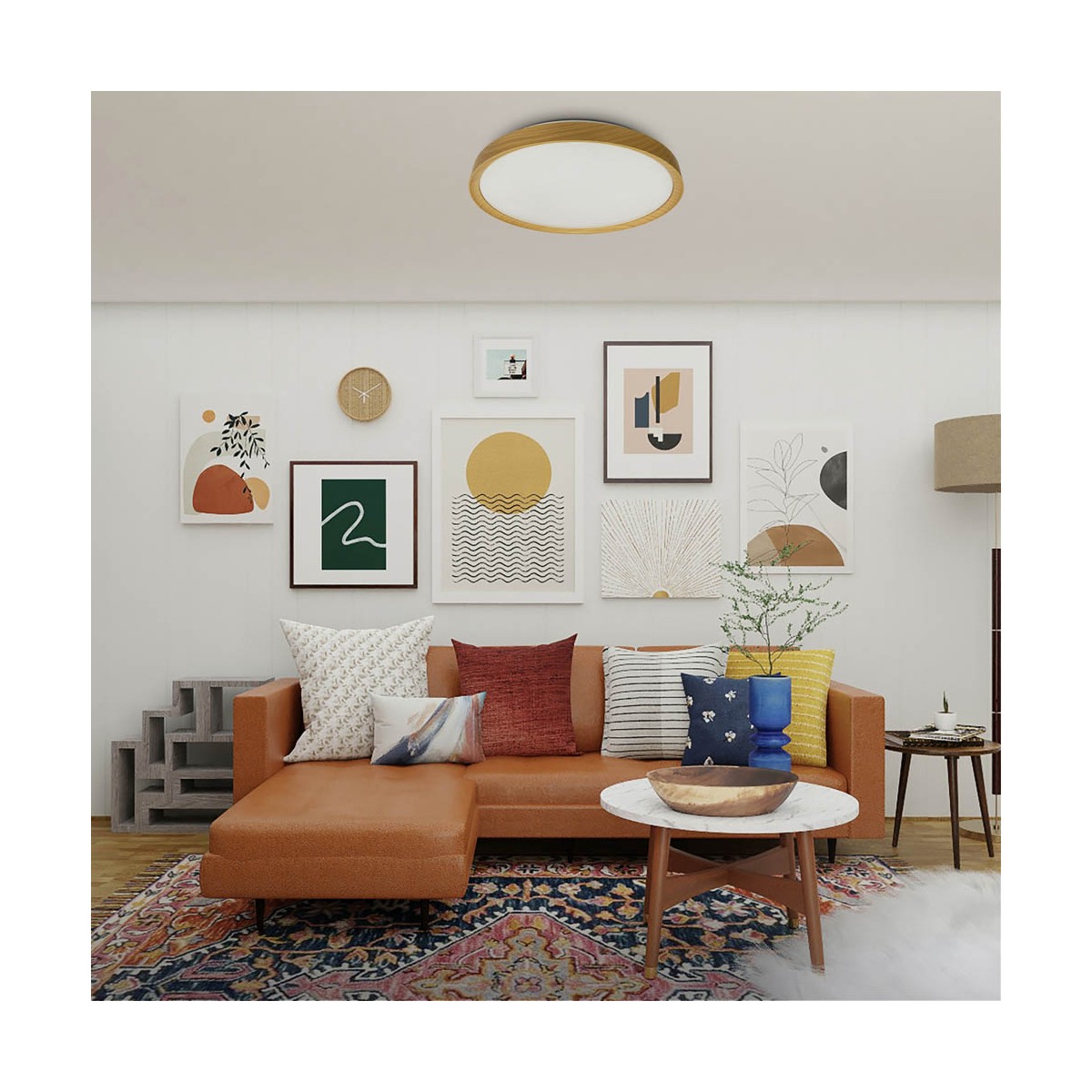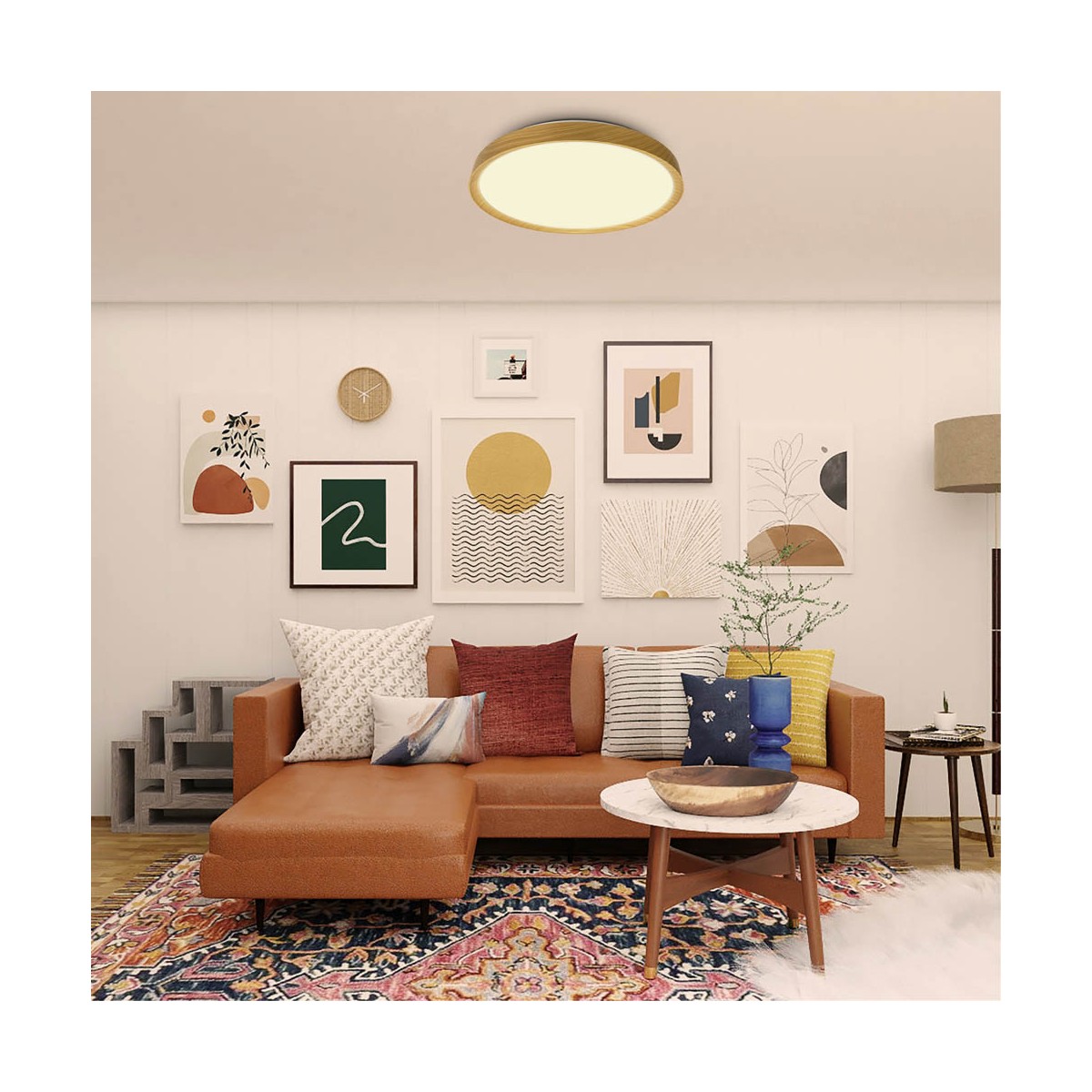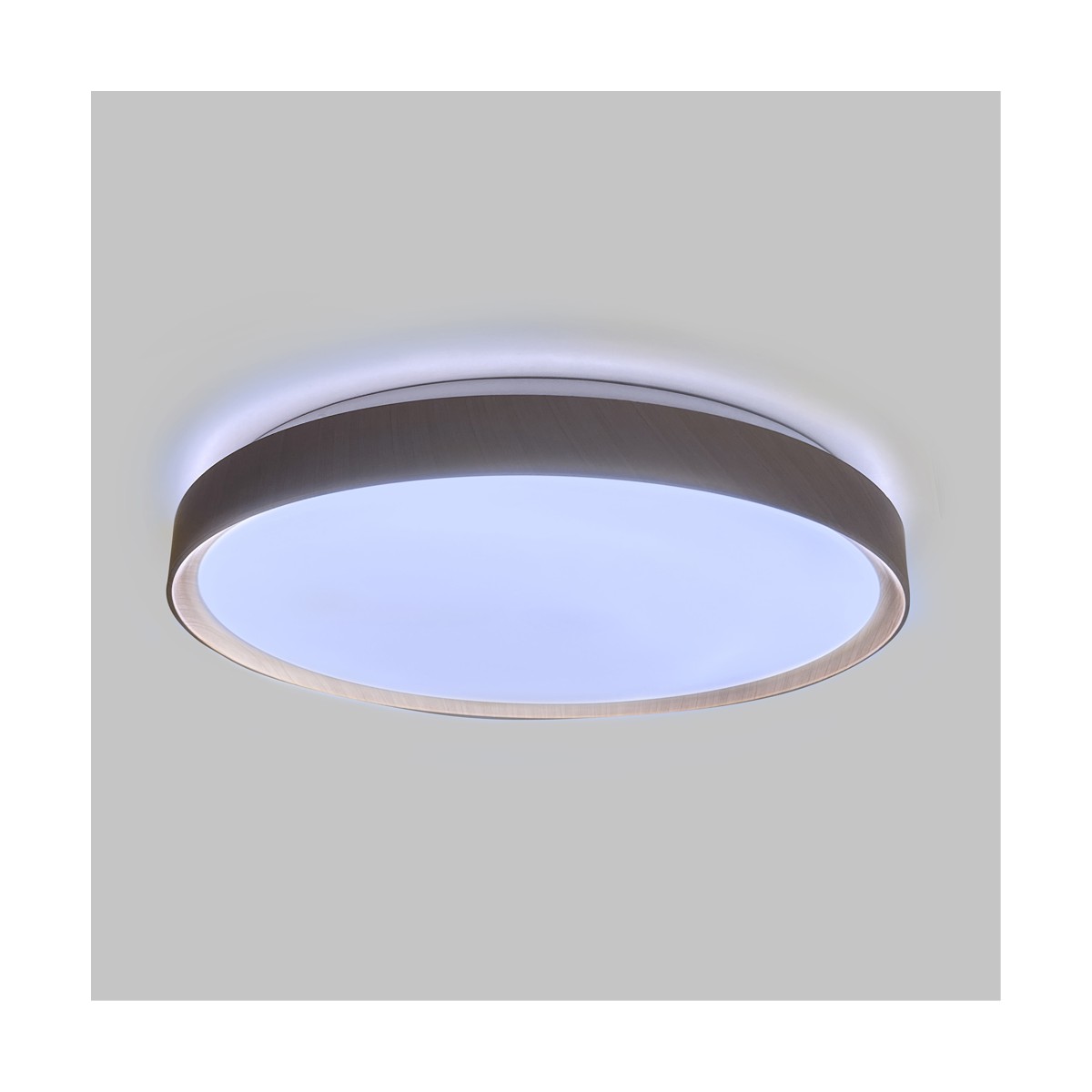 Plafón de techo LED Cres con tres temperaturas de color. Plafón circular con un decorativo efecto madera ideal para colocar en estancias con muebles de madera o colores blanco y negros. Amplio difusor el cual permite proyectar la luz de manera homogénea hacia abajo. El plafón incluye mando a distancia para controlar la iluminación y adaptarla a nuestras necesidades, regulando la intensidad o variando el tono de color.