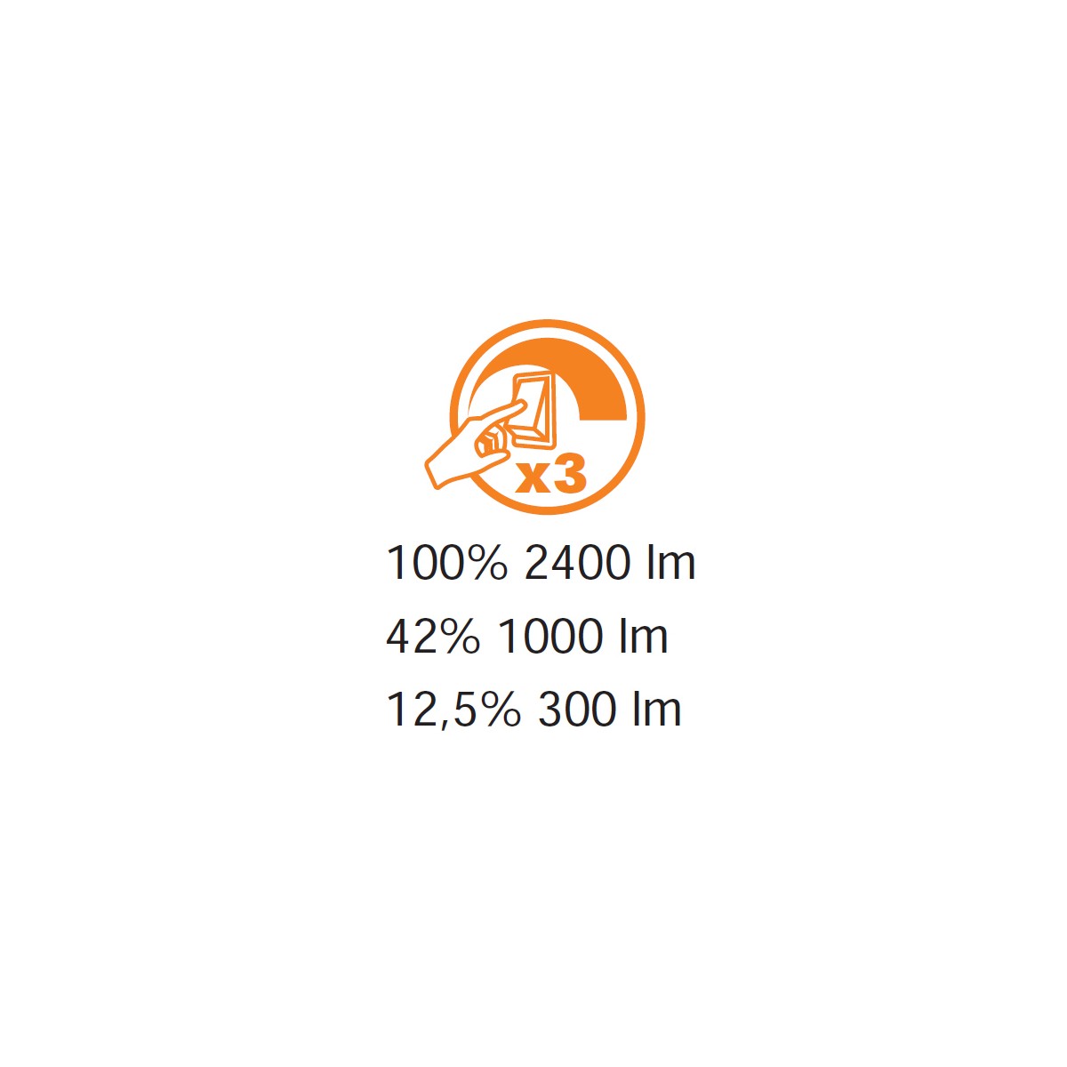 El plafón es dimmable con tres intensidades de luz intercambiables con el habitual interruptor de pared: 12,5% (3W-300lm) / 42% (12W-1000lm) / 100% (30W-2400lm).