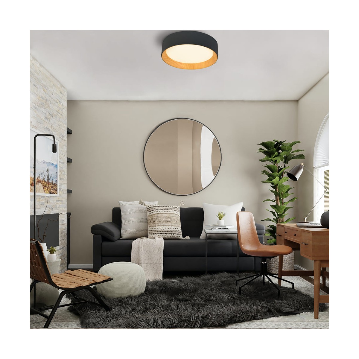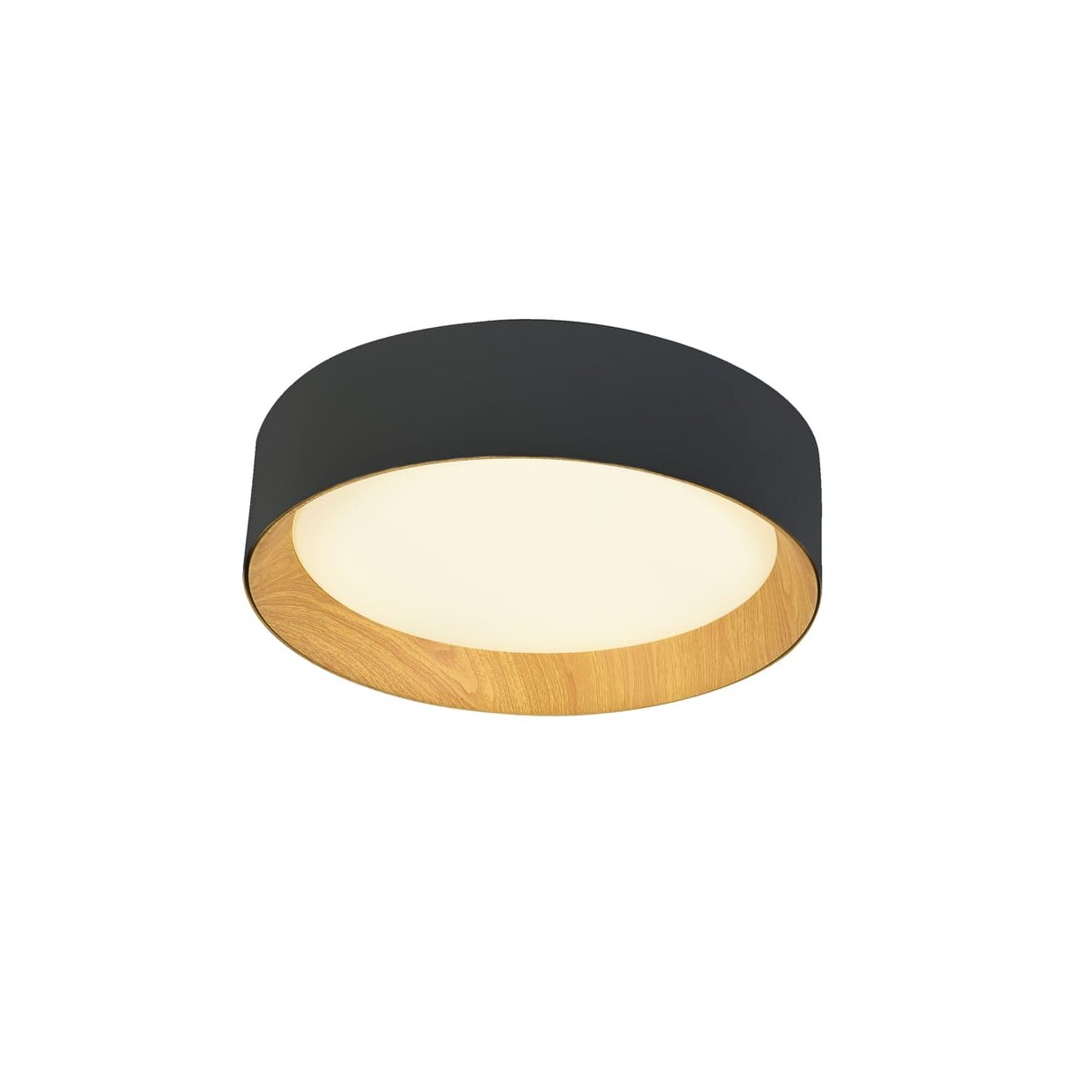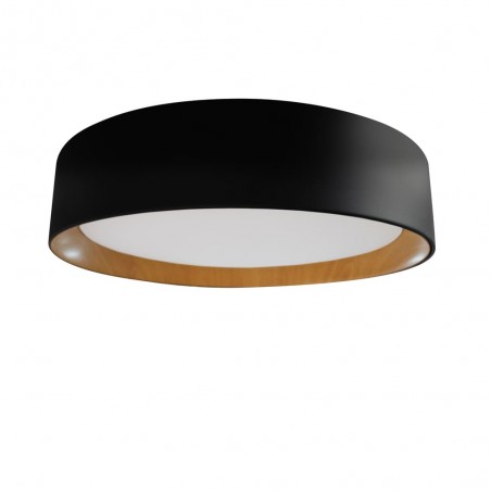 Plafón de techo LED Lea para la iluminación de dormitorios y salones. La decoración efecto madera de la parte interior es el principal reclamo de este plafón de techo de estilo nórdico. El plafón tiene una forma circular, fabricado en aluminio con el exterior de color negro. Iluminación LED cálida de 60W e intensidad lumínica de 3020 lúmenes. Este plafón está disponible en color blanco o negro.
