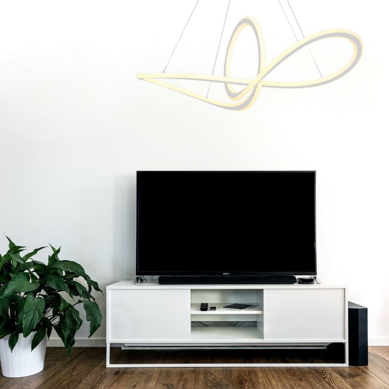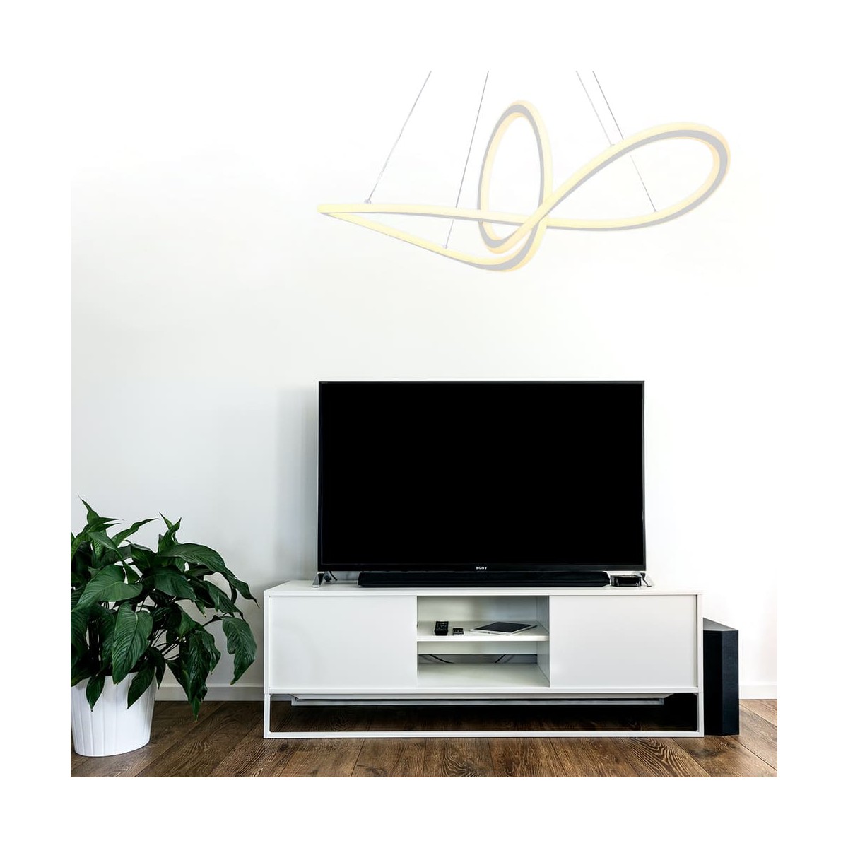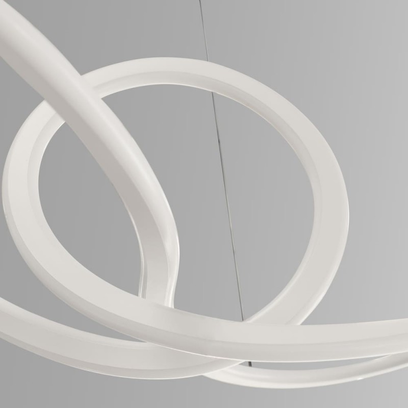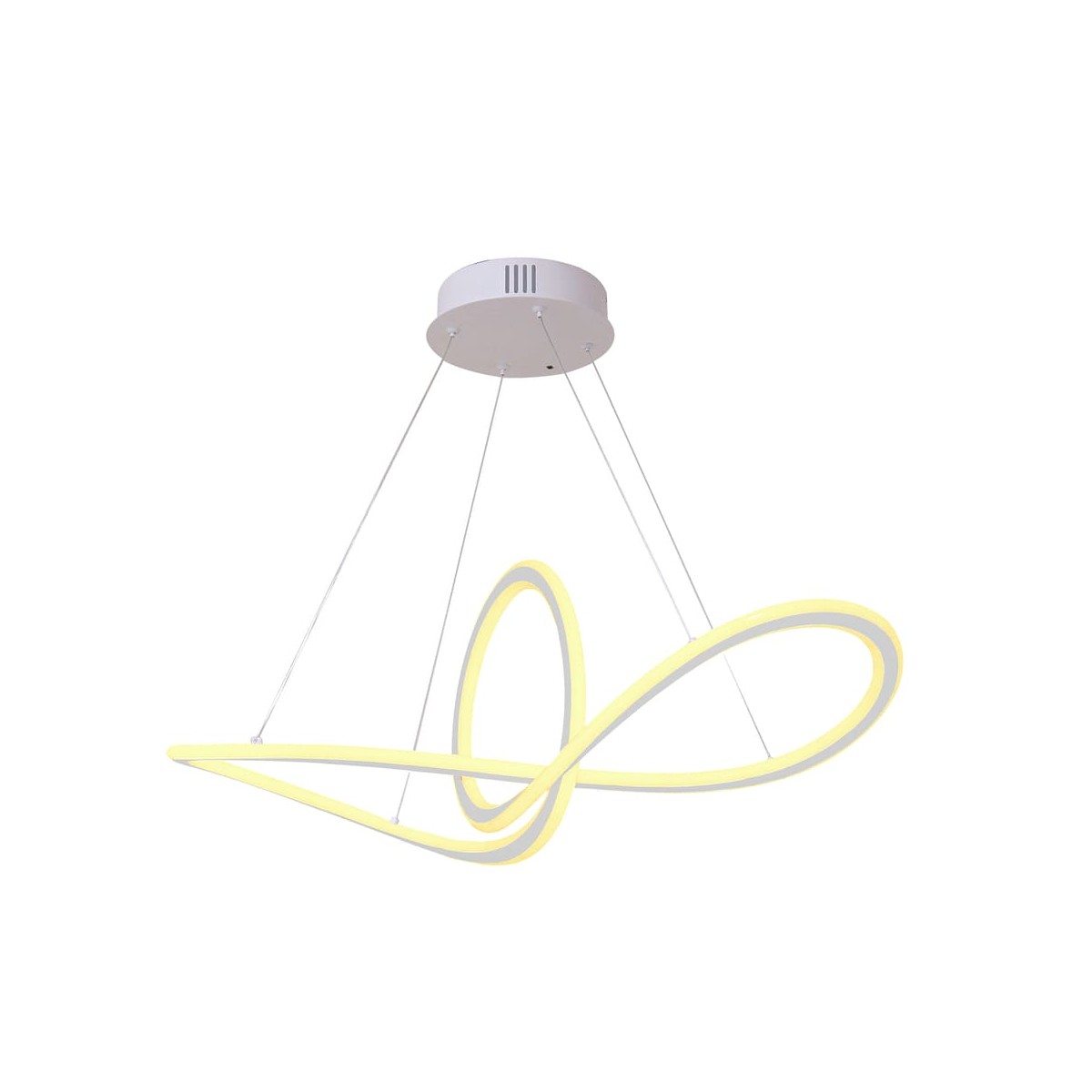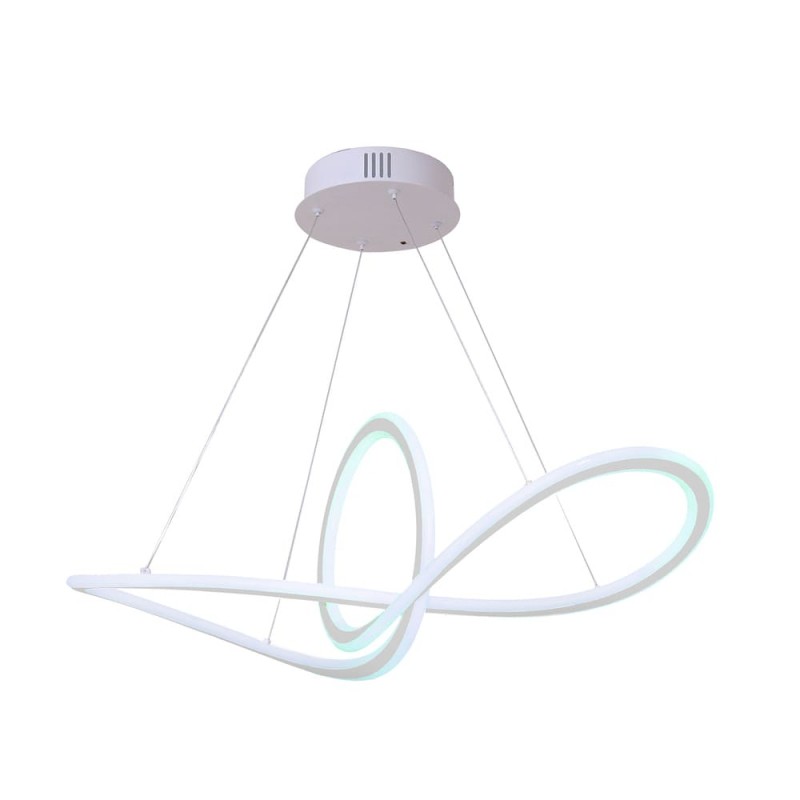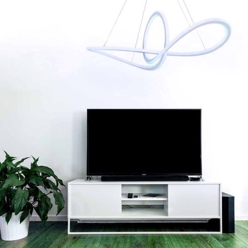 Lámpara colgante para salones modernos. Lámpara de techo con un original diseño ideal para la iluminación decorativa de un salón o un comedor. Incluye un mando a distancia para regular la intensidad de luz y seleccionar entre tres tonos de temperatura de color (2800-4000-5500ºK). La lámpara cuenta con memoria de encendido y un modo de luz de noche. Fabricada en aluminio de color blanco y difusor de policarbonato.
