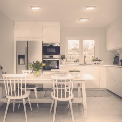 Downlight de superficie cuadrado con iluminación Led de 6W. Dispone de tres tonos de luz (2700K, 4000K y 5500K) que cambian al encender y apagar el plafón. El driver permite seleccionar la temperatura a la que enciende siempre el plafón.
