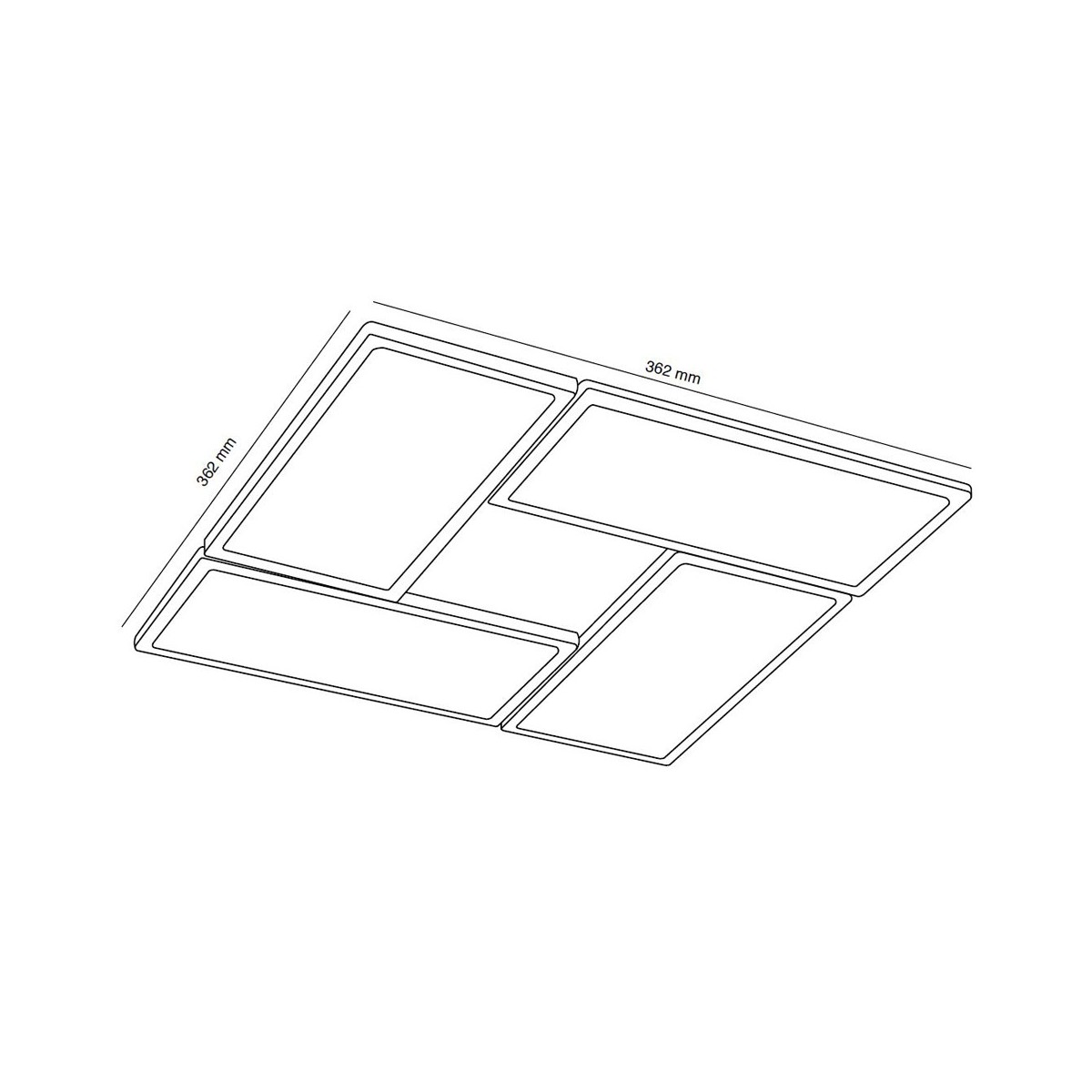 Plafón con cuatro luces LED SMD integrado. Tiene una potencia de 60W, 3600lm, luz cálida de 3000K regulable en intensidad. La estructura del plafón es de aluminio lacado en negro.