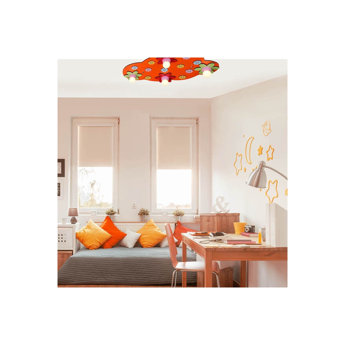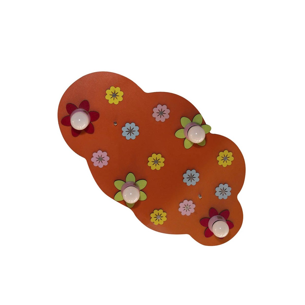 Plafón de techo infantil con flores en color naranja modelo Bloom. Para 4 bombillas E27 (no incluidas) muy fáciles de cambiar. Estructura con forma irregular fabricada en contrachapado y plástico. Perfecto para dormitorios infantiles y juveniles.