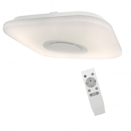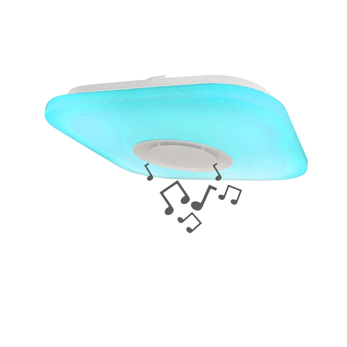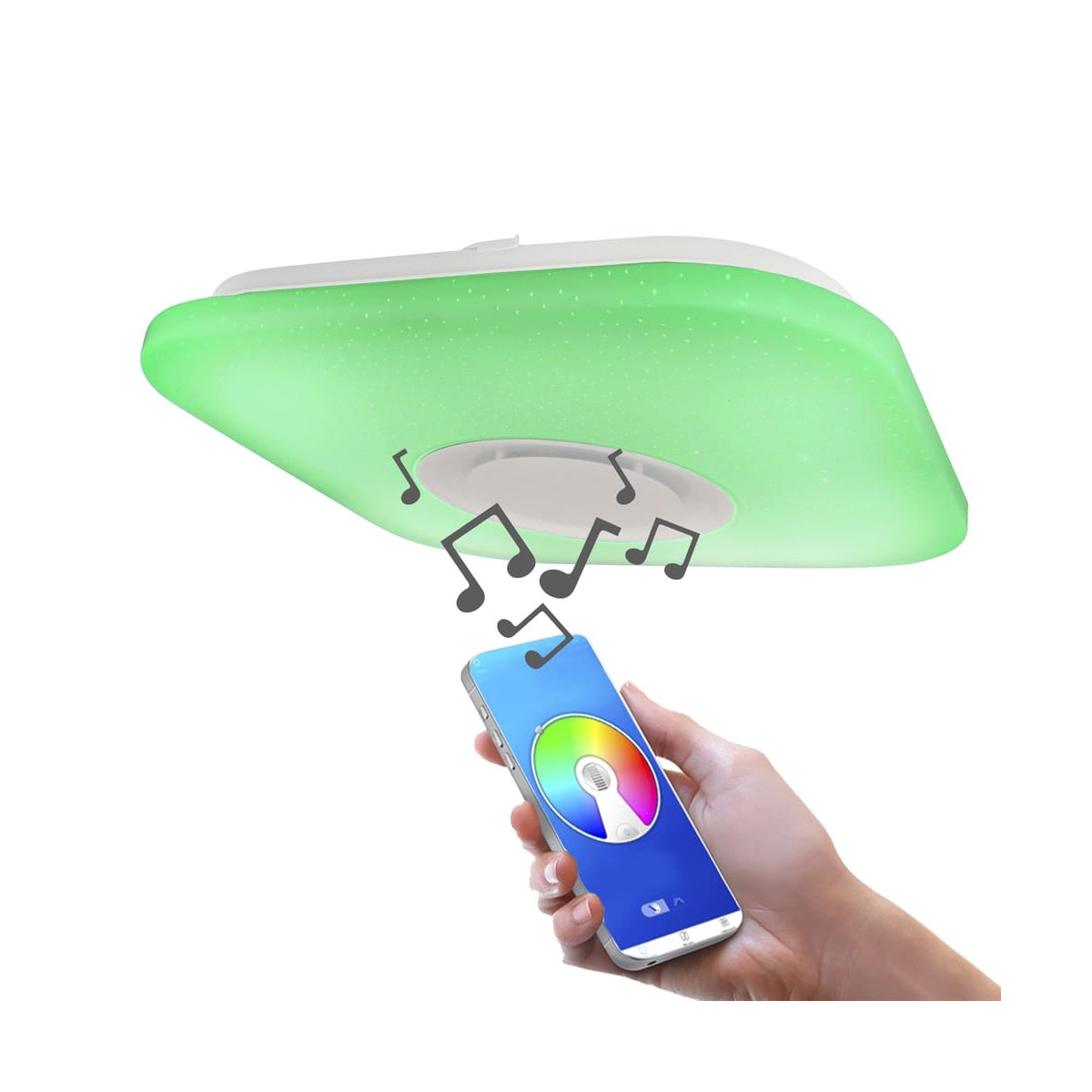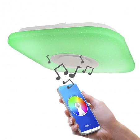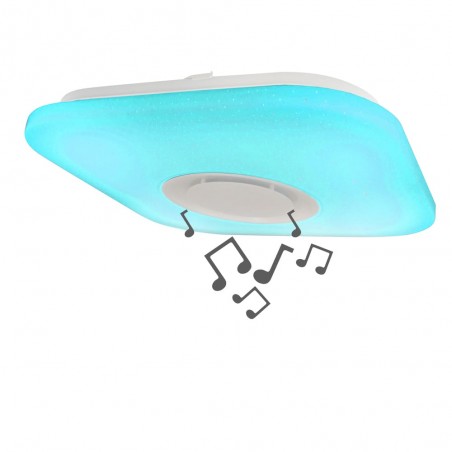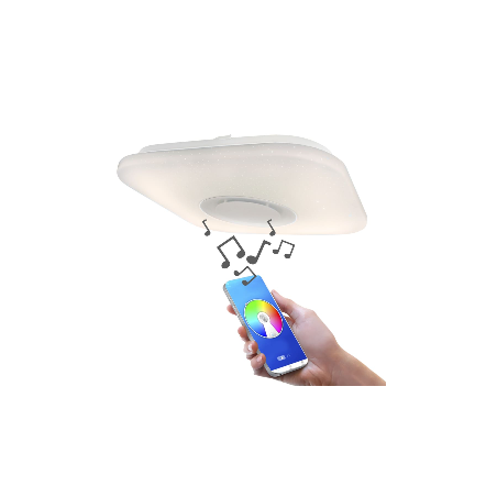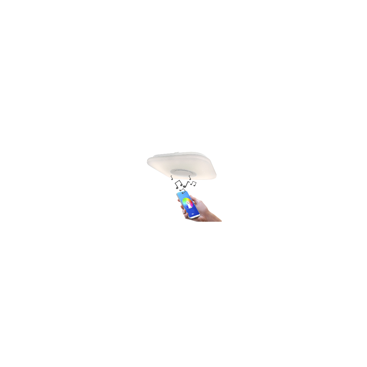 Plafón de techo cuadrado con luz LED RGB y altavoz. Plafón de techo muy práctico para iluminar dormitorios y salones. Intensidad de lúmenes y temperatura de color regulables (3000-6500K) con una amplia gama de colores RGB. Se controla con un mando a distancia con capacidad para hacerlo también desde el smartphone vía APP. Cuenta con un altavoz integrado para reproducir música. Difusor de PVC blanco.