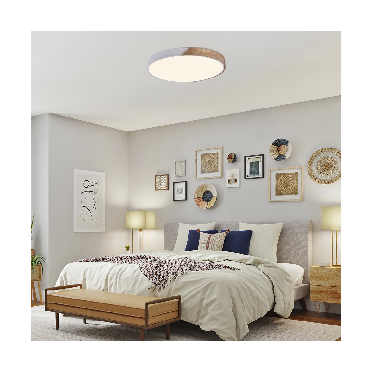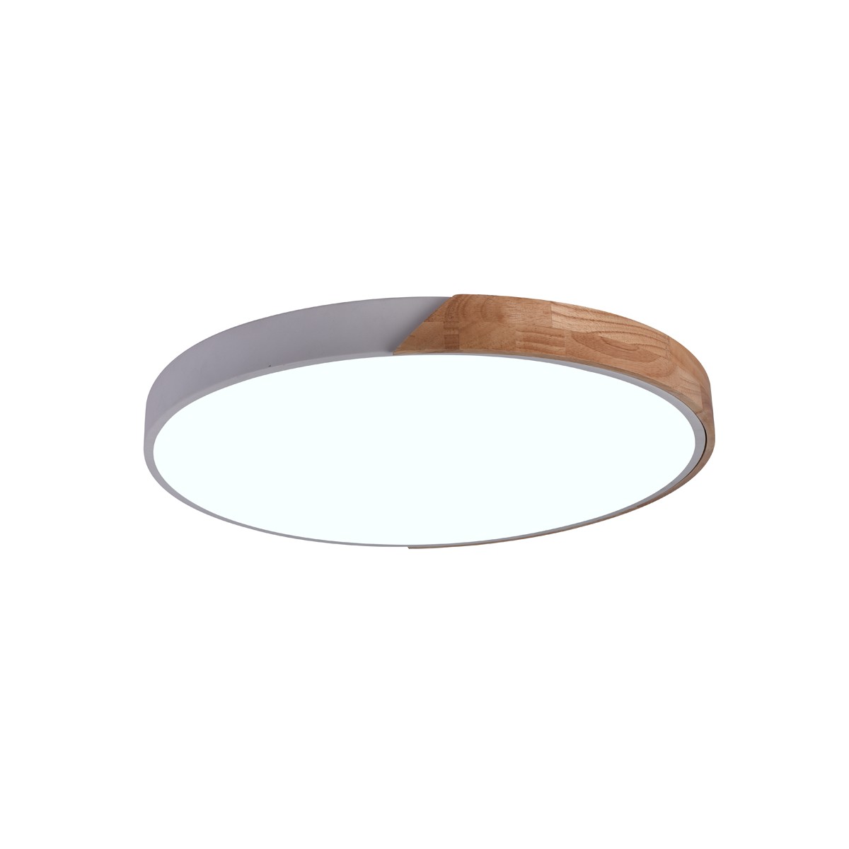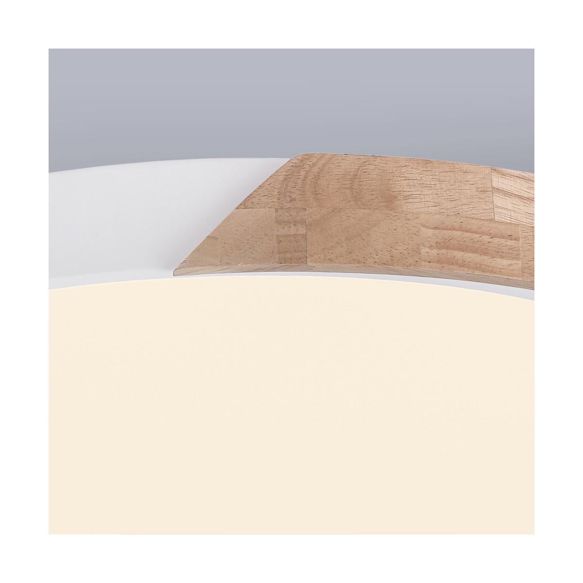 Plafón de techo LED Taoro con tecnología SMART. Plafón de techo circular de color blanco con una pieza decorativa de madera. Puedes regular tanto la intensidad de lúmenes como seleccionar la temperatura de color de la iluminación (3000-4000-6000K). Memoria de encendido y modo configurado luz de noche. El plafón incluye mando a distancia y puede controlarse también con el smartphone por conexión bluetooth (tecnología smart).