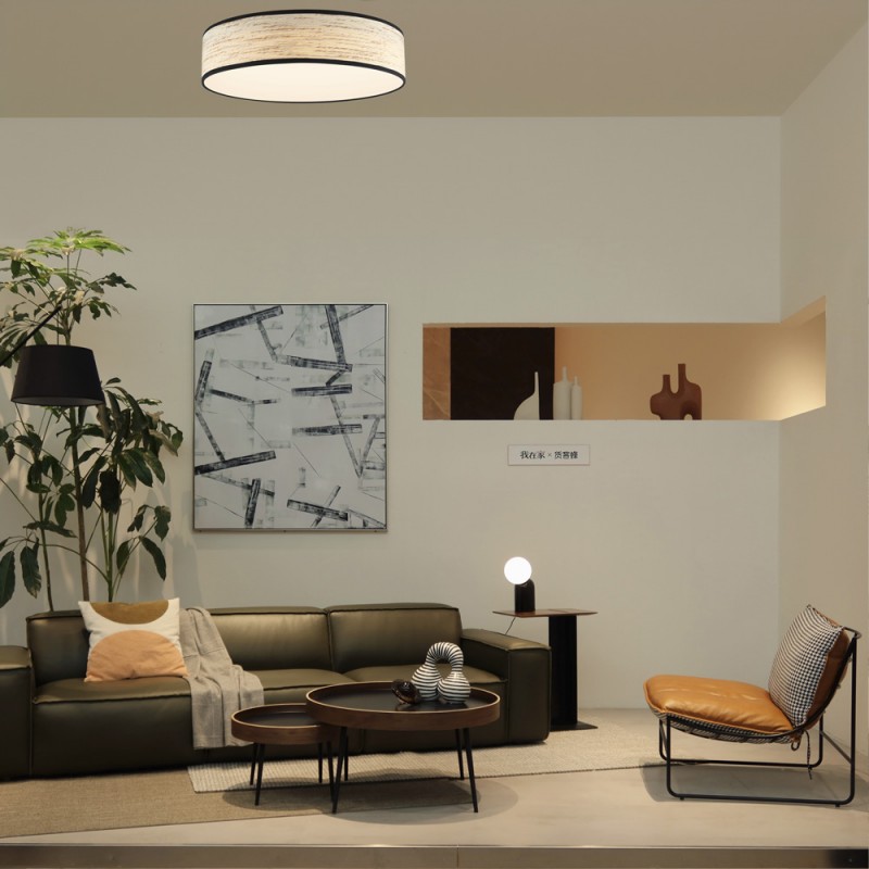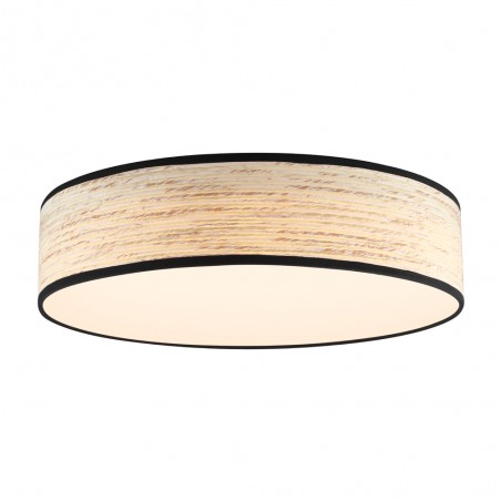 Plafón de techo LED con tres temperaturas de color*. Plafón de techo boho chic para la iluminación de salones y dormitorios. Diseño circular de 60 centímetros de diámetro con pantalla de fibras naturales efecto corteza clara. Su iluminación LED integrada se proyecta de manera difusa aportando una luz óptima en la estancia.