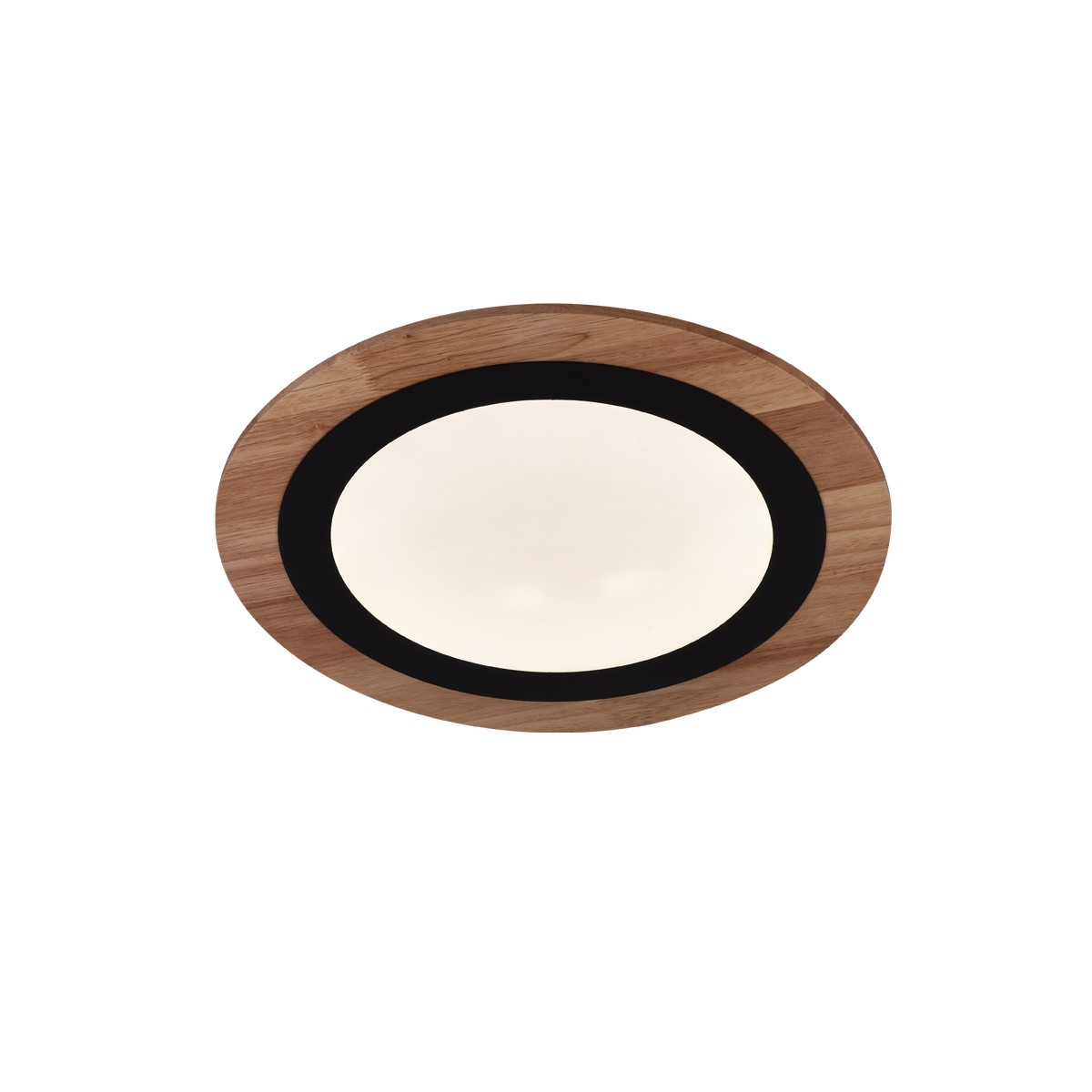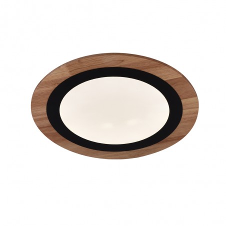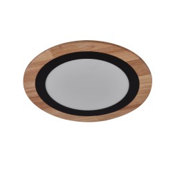 Plafón de techo LED Smart para salones y dormitorios. Plafón circular con tecnología Smart y bluetooh para controlar la iluminación desde un smartphone o tablet. Compacto diseño de forma circular en color madera y un aro interior de color negro. Lleva integrada iluminación LED de 24W y 1800 lúmenes regulable en tono e intensidad de luz. Incluye mando a distancia.