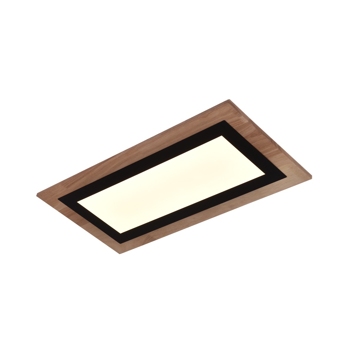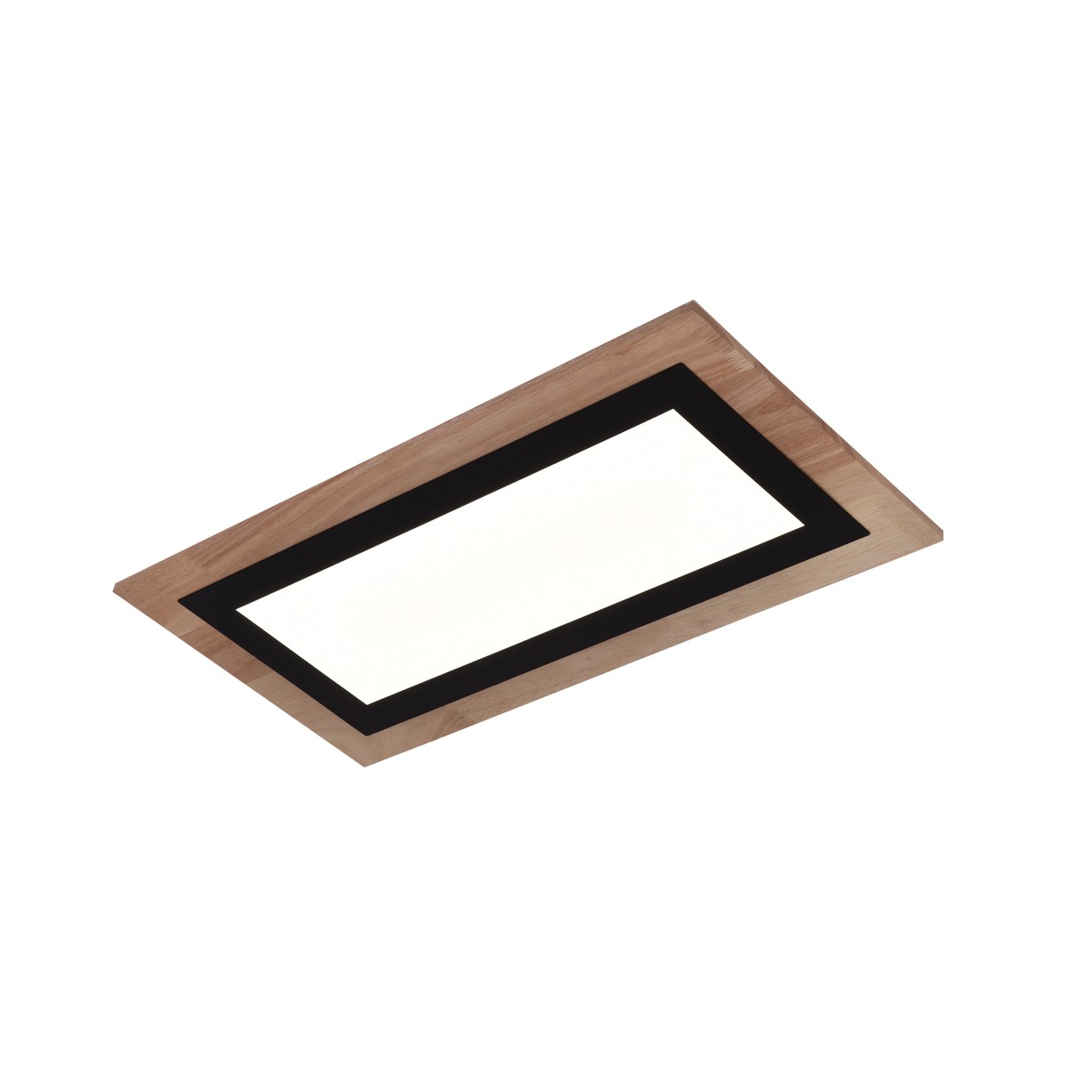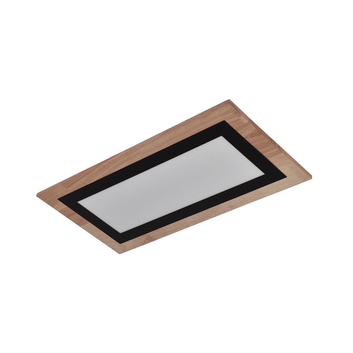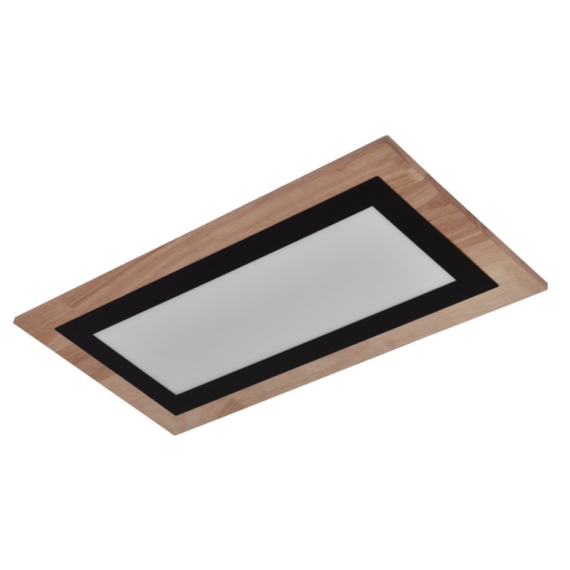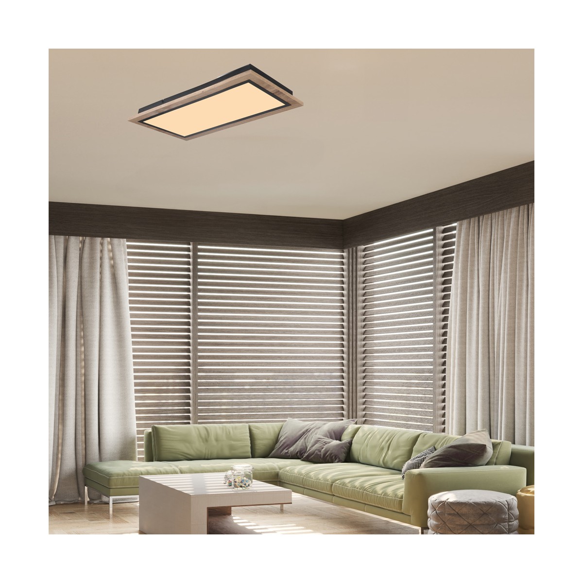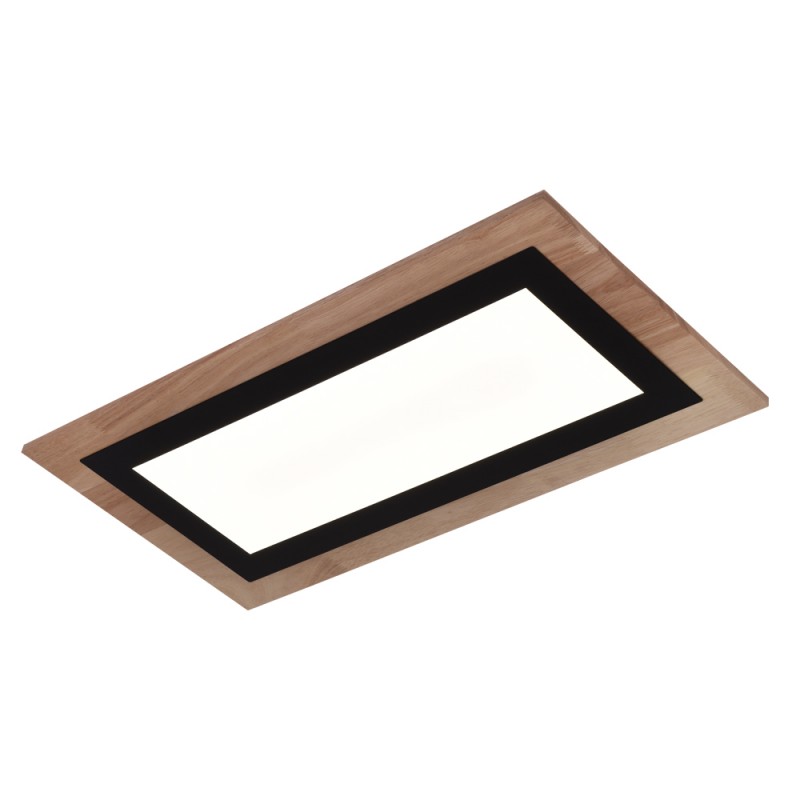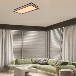 Plafón LED Smart para salones y cocinas. Plafón rectangular con tecnología Smart y bluetooh para controlar la iluminación desde un smartphone o tablet. Diseño de forma rectangular en color madera y un marco interior de color negro como contorno del difusor. Lleva integrada iluminación LED de 45W y 4400 lúmenes regulable en tono e intensidad de luz. Incluye mando a distancia.