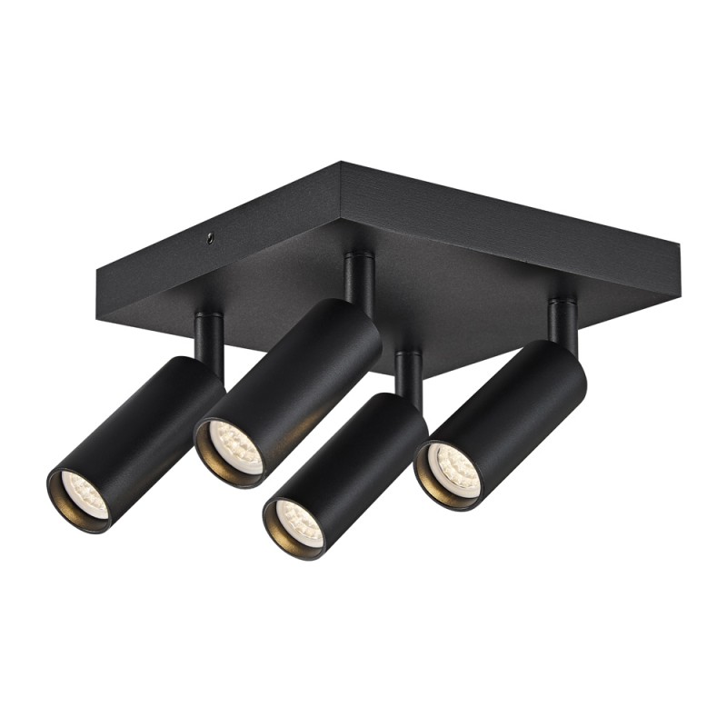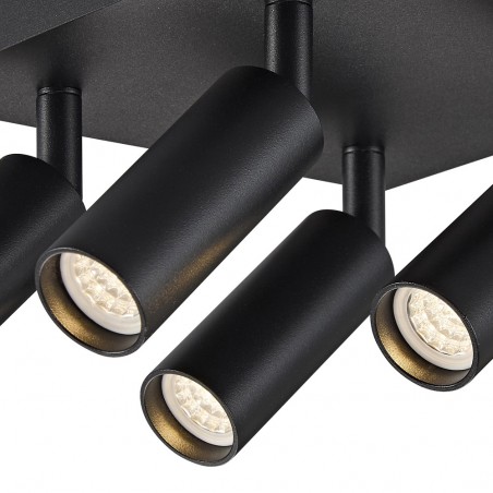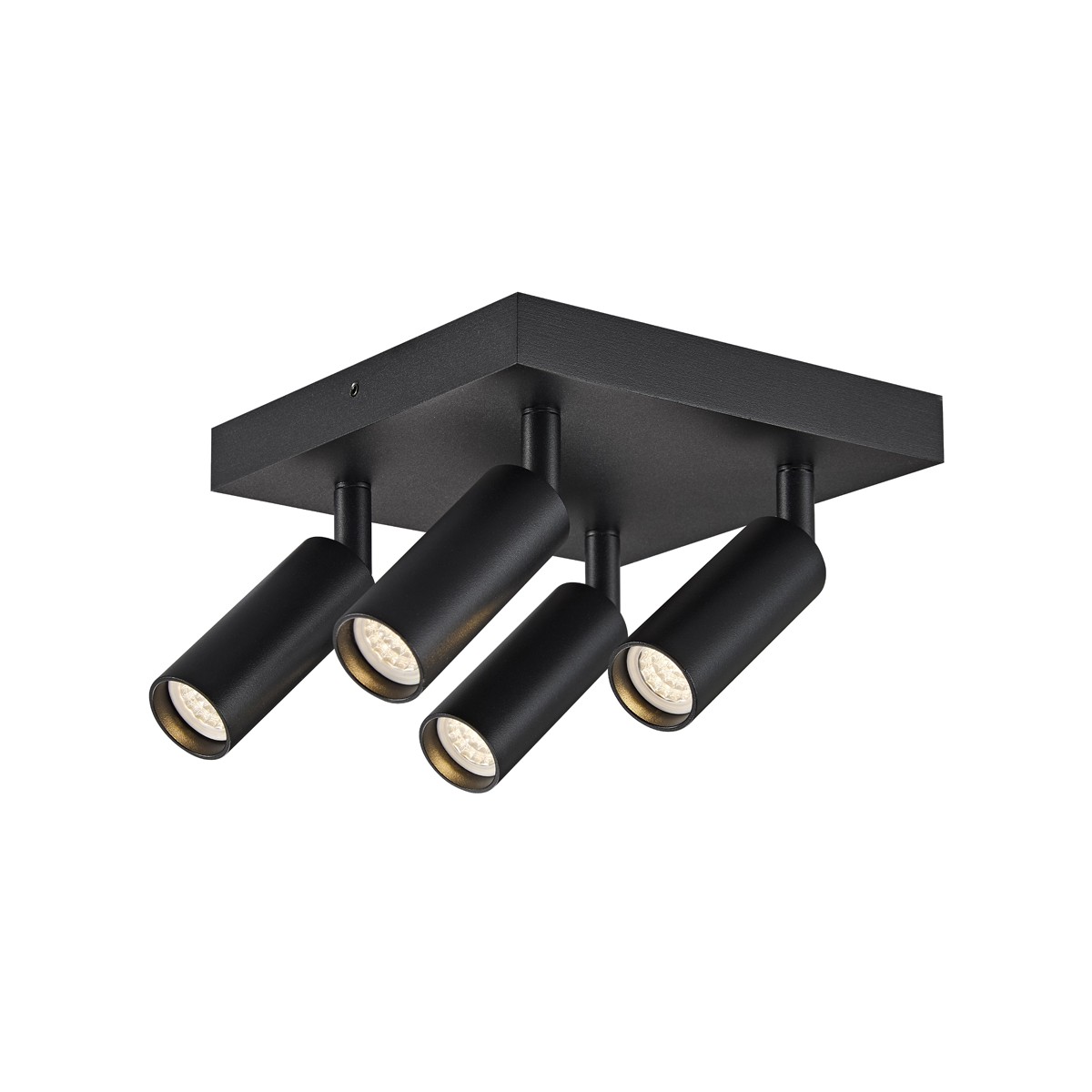 Plafón de techo con cuatro focos orientables. Focos tubulares de aluminio acabado negro arenado, para bombillas G9 LED (no incluidas). Cada foco puede moverse de manera individual para dirigir la luz al punto deseado. La base es de 250 x250 mm.