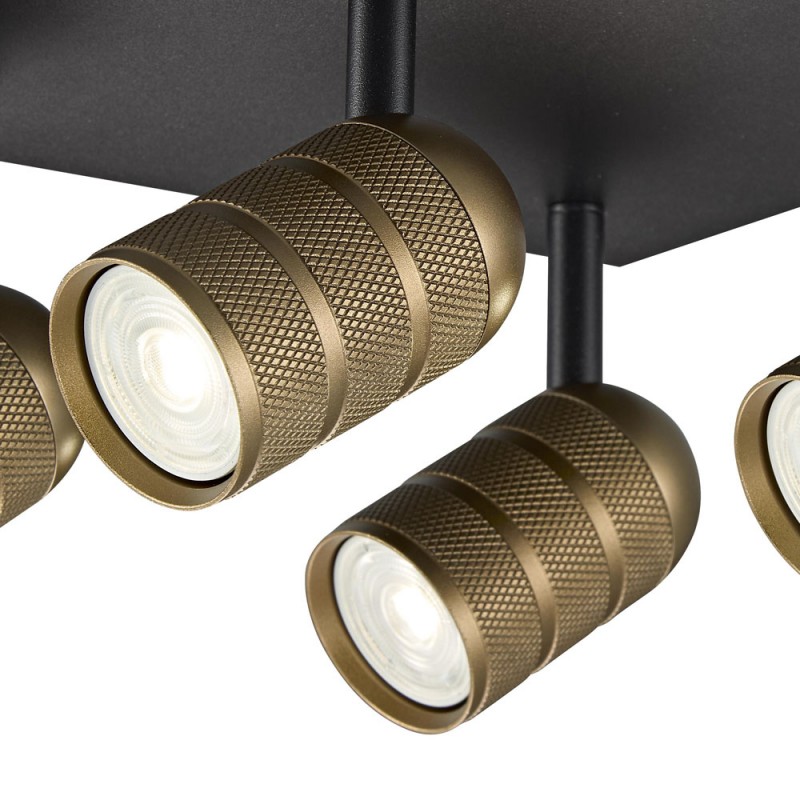 Plafón de techo con focos orientables. Los focos están diseñados para funcionar con bombilla GU10-35 (no incluidas). Cada foco puede moverse de manera individual para dirigir la luz al punto deseado. Base de color negro y focos dorados. La base de 200x200 mm.