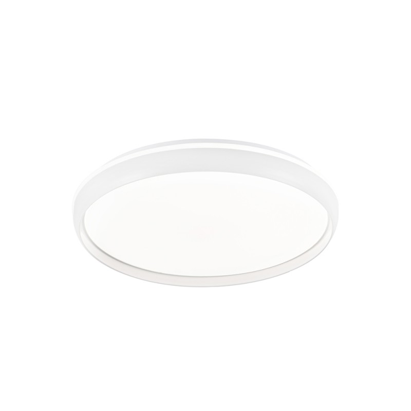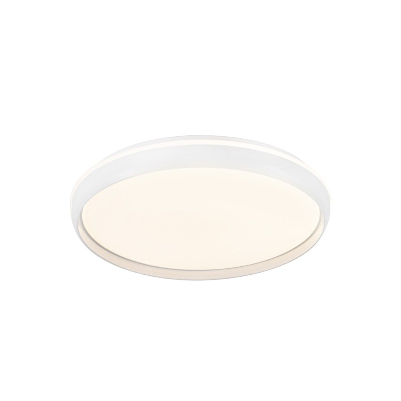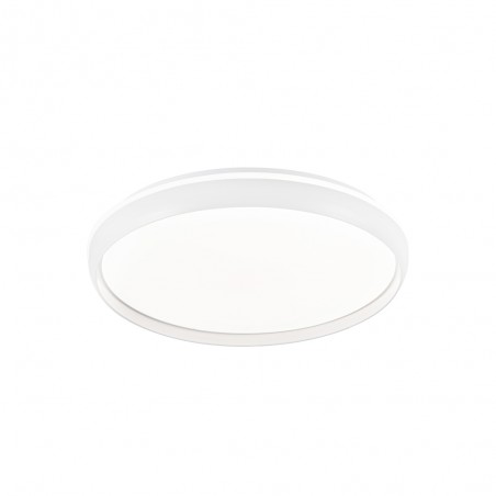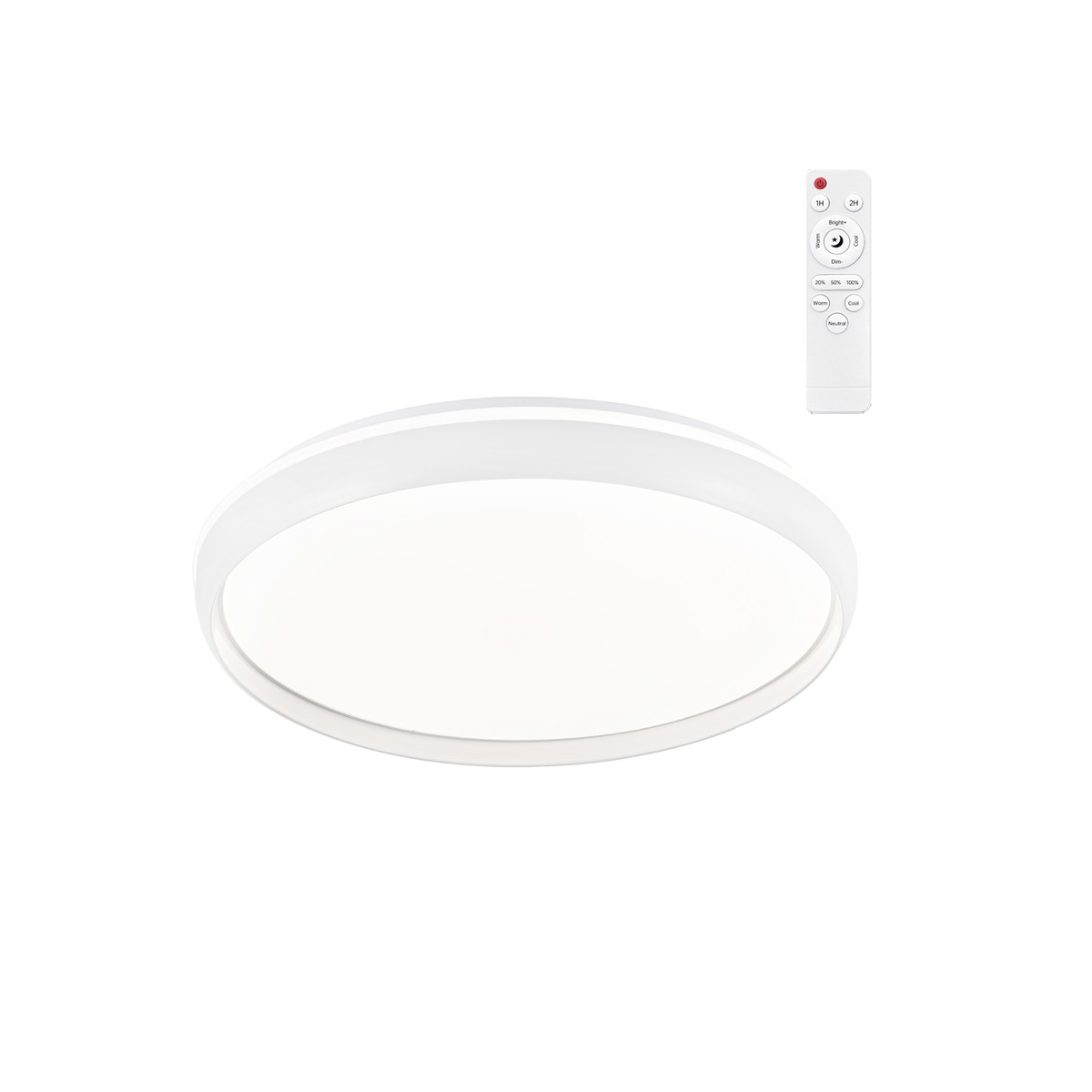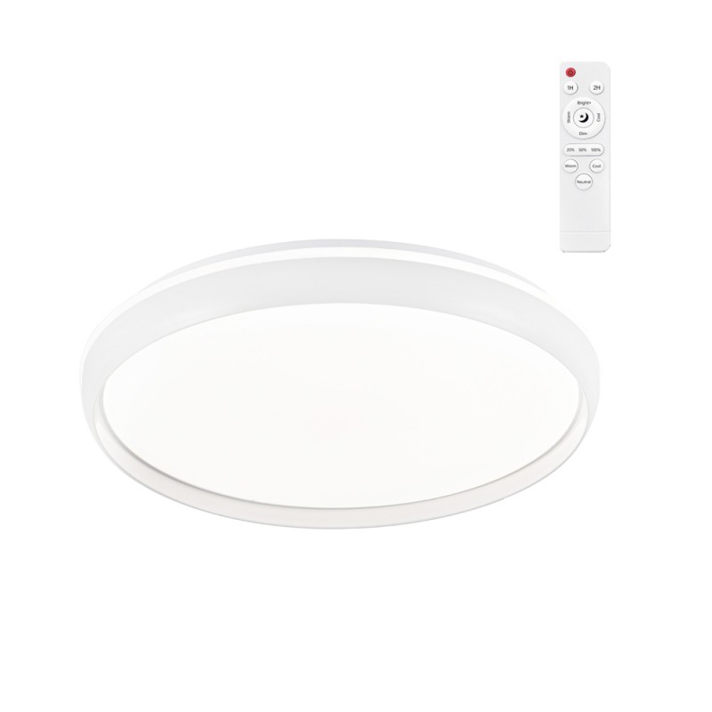 Plafón de techo LED 3CCT dimmable Charly. Plafón de techo de 40 centímetros de diámetro diseñado para la iluminación principal de un dormitorio o de un salón. Lleva integrada iluminación LED con tres intensidades (20-50-100%) y tres tonos de color (3000-4000-6000K), además de poder regular ambas gradualmente. Tiene una configuración de luz modo noche, memoria de encendido y temporizador (1-2H) para programar el apagado. Mando a distancia incluido. LED 46W, 5060 lm. y 3CCT.